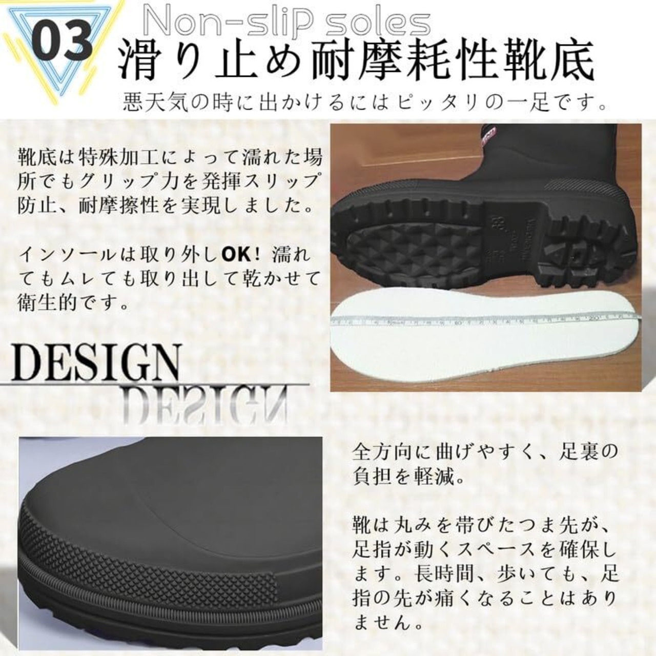 【細部までの拘り設計が魅力】歩きやすい軽量タイプ。全方向に曲げやすく、足裏の負担を軽減。靴は丸みを帯びたつま先が、足指が動くスペースを確保します。内側は足あたりのいいさらりとした布張りで。中敷きがクッションが効いててフカフカしてとても歩き安い。