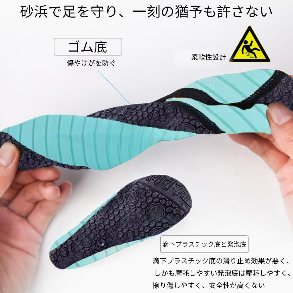 【超軽量】歩く時、軽くて足に負担を会えなくて 、履いても素足みたいな履き心地。超軽量、やわらかいで、圧縮できて、持ちやすい。とても便利です。子供によって負担がない。砂や小石が入り込んだりもしないので、子供の足を守るウォーターシューズです