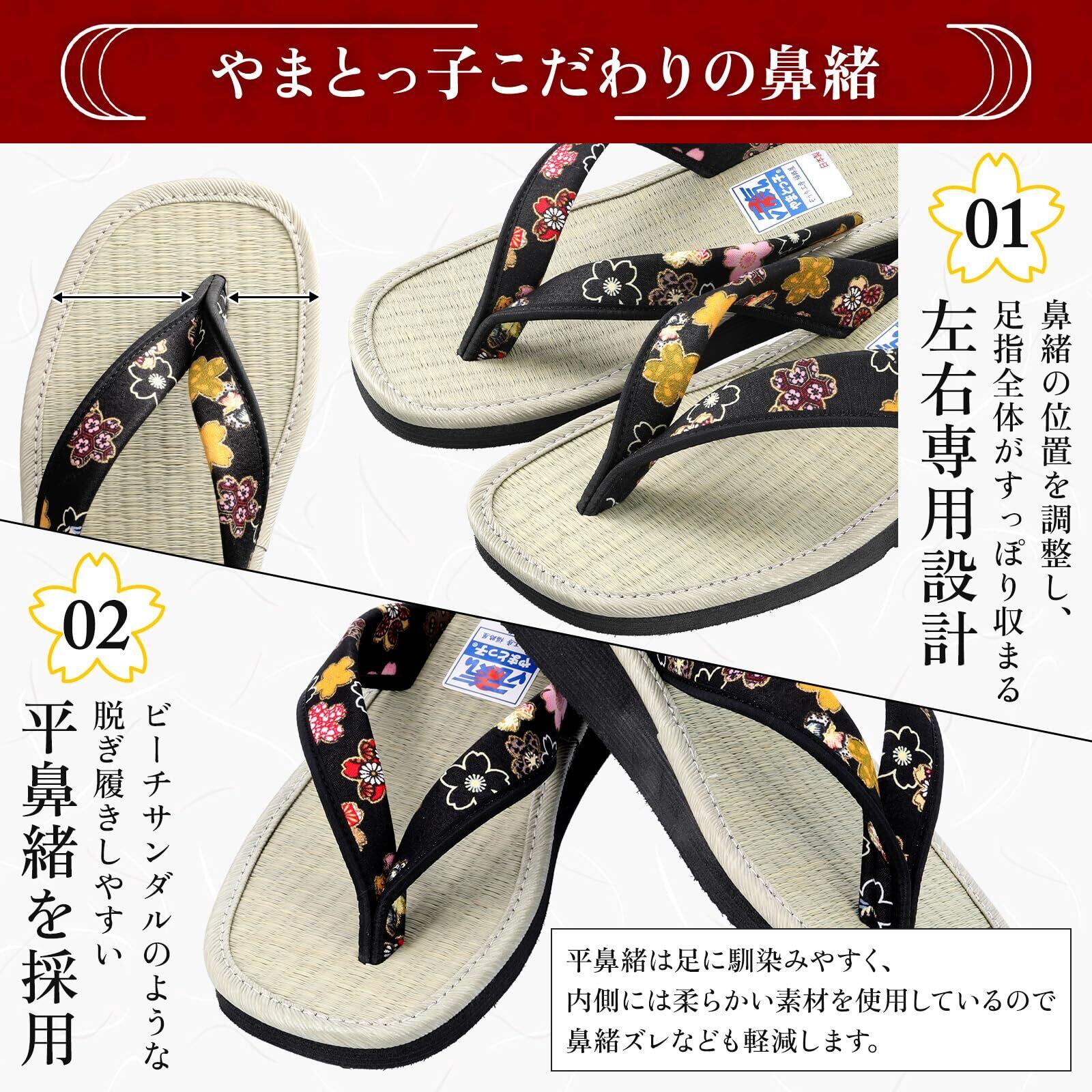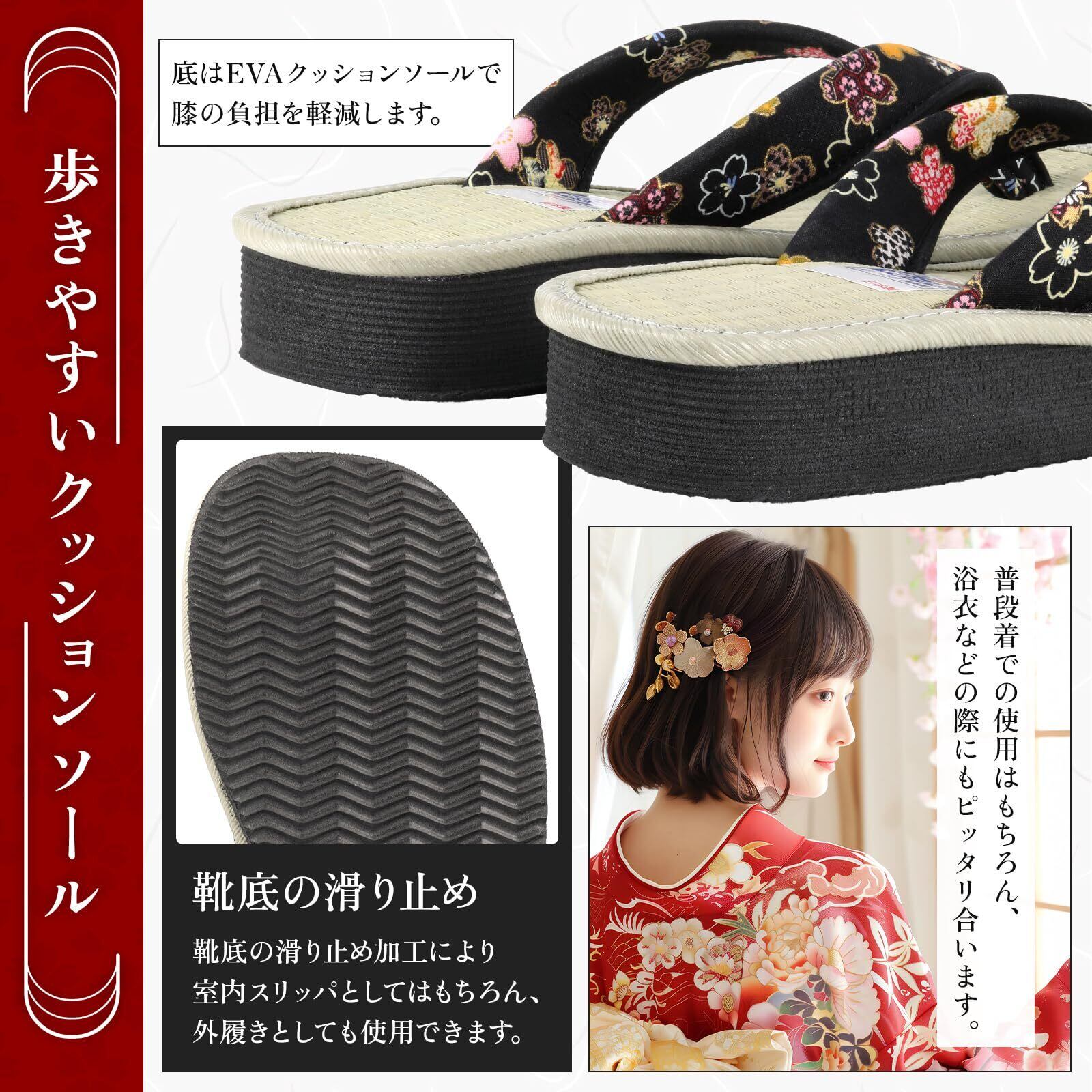【おしゃれな和柄デザイン!和装にもカジュアルにも】華やかな和柄のデザインで、浴衣や作務衣にはもちろん、普段使いにもぴったりな草履。カジュアルな服装にもマッチし、足元からおしゃれを演出します。お気に入りの柄を選んで、自分らしいスタイルを楽しみましょう。