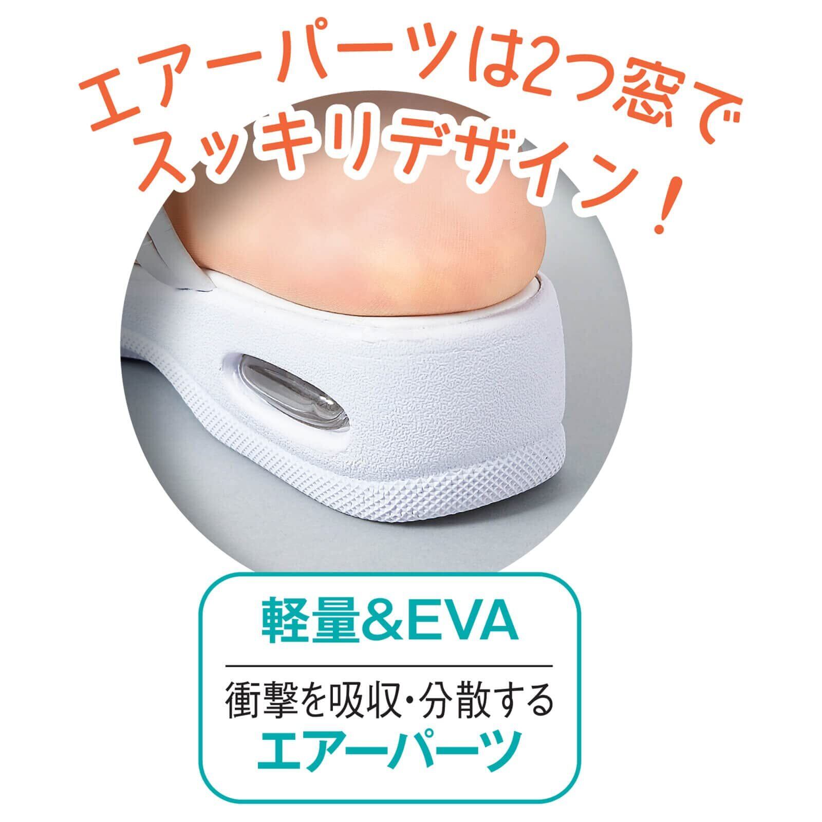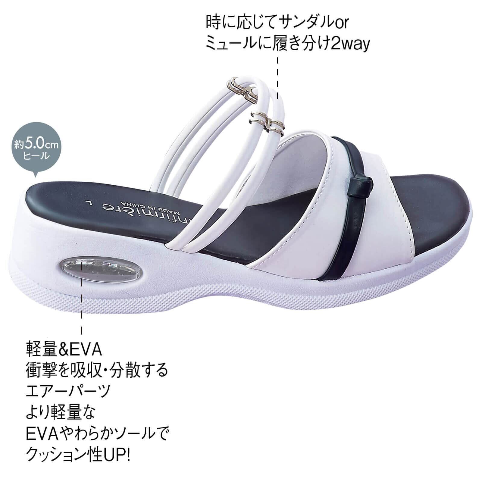 かかとで衝撃を吸収して分散!!疲れや膝腰痛などの原因となる着地の衝撃。それを吸収するエアーパーツを標準搭載したアンファミエオリジナルデザインサンダル。疲れにくさも美脚も叶えるエアー付き2WAY!衝撃から膝や腰を守るエアーパーツサンダルエアーパーツは2つ窓でスッキリデザイン時に応じてサンダルorミュールに履き分け2way【軽量&EVA】衝撃を吸収・分散するエアーパーツより軽量なEVAやわらかソールでクッション性UP!【ノンスリップラバー】滑り止め付きの新底で床面をしっかりグリップし安全性を確保