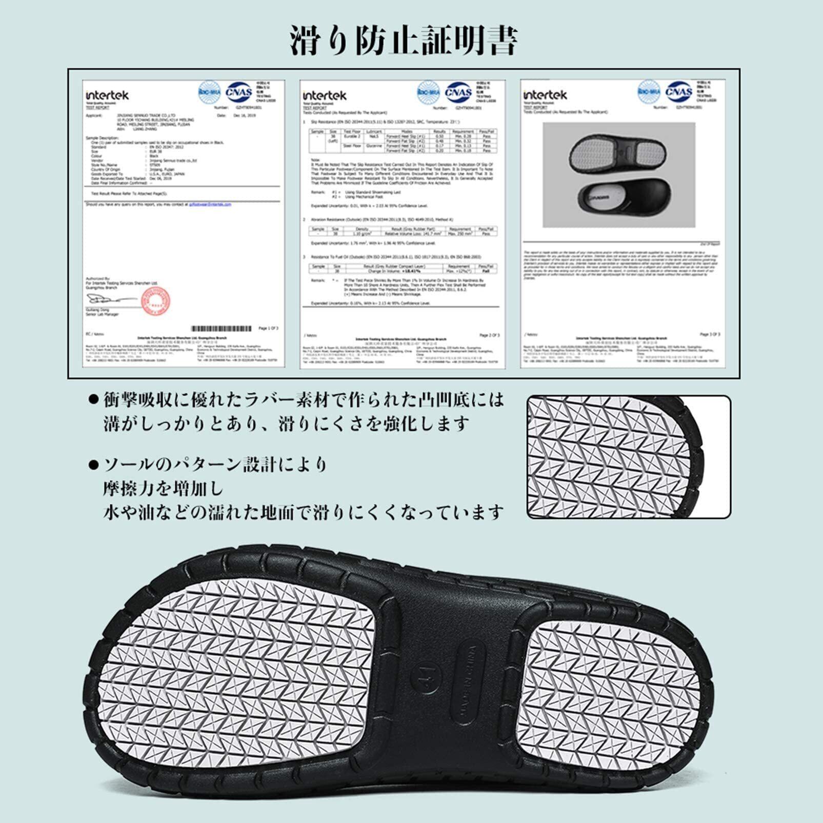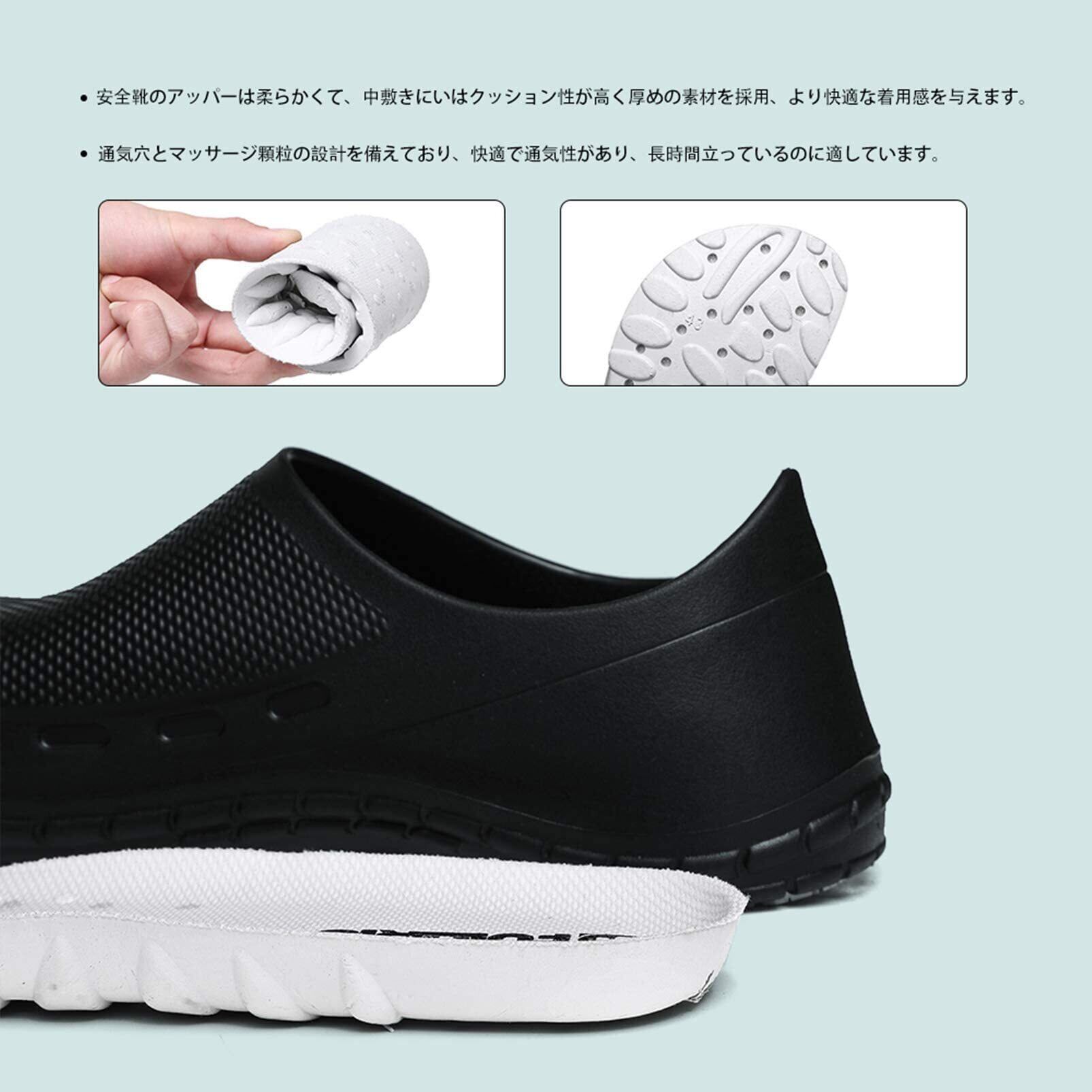 【滑り止め靴底と取り外し中敷き】特殊構造の靴底は水・油でに濡れた地面でも滑りにくいから安全性を高めています。また、油による劣化を防ぐ機能がある耐油性のゴム底なので、長く使用することができます。インソール取り出して洗える、常に清潔に保てる仕様。抗菌・防臭タイプで臭いにくい!