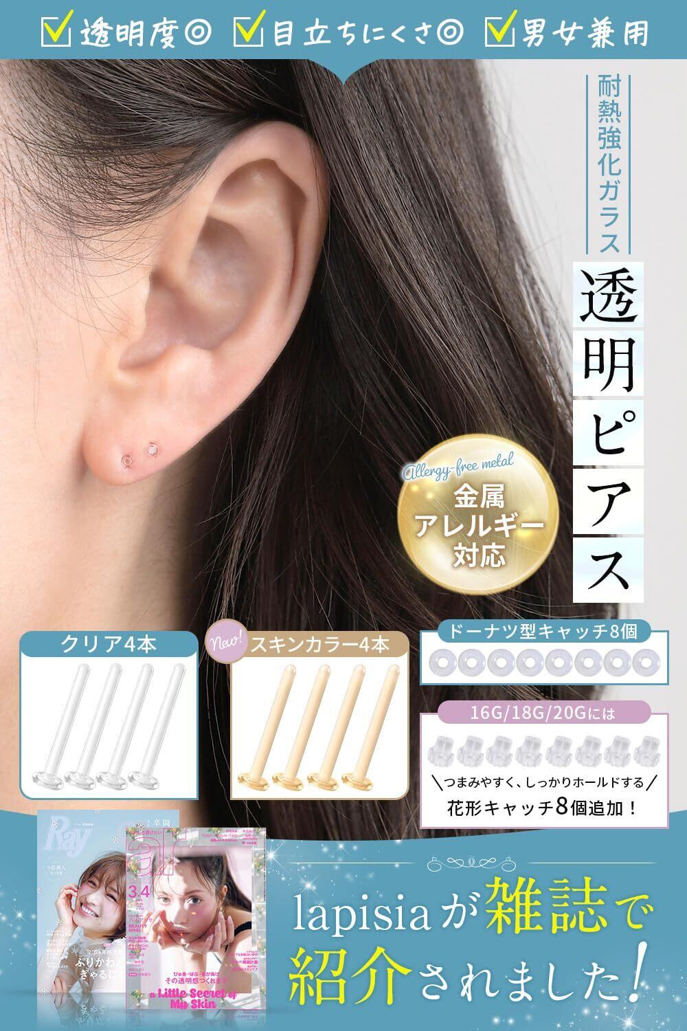 【欲しいサイズが見つかる豊富な36バリエーション】色はクリアとスキンカラーの2種類、太さ(ゲージ)は、20G(直径約0.8mm)、18G(直径約1.0mm)、16G(直径約1.2mm)、14G(直径約1.6mm)、12G(直径約2mm)、10G(直径約2.5mm)、8G(直径約3mm)の7種類から、長さは、約10mm、約12mm、約14mmの3種類から、また形状はストレート、カーブ(長さ12mmのみ)の2種類からお選びいただけます。※試着後サイズが合わなかった場合はお気軽にlapisia公式LINEアカウントまでお問合せください。