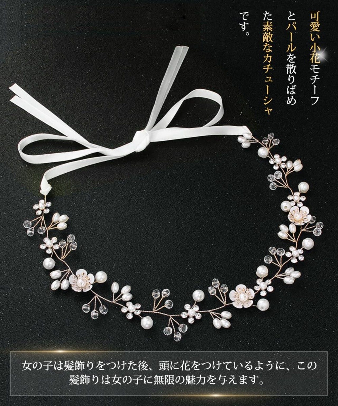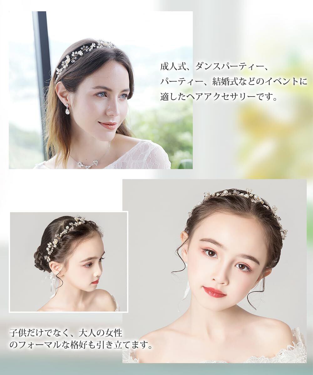 サムコス 髪飾り 花 クリスタルビーズ パール 花かんむり リボン ホワイト ヘッドドレス 花冠 ヘアアクセサリー 結婚式 発表会 披露宴 卒業式 パーティー ダンス 和装 撮影 写真 子供 大人用 (A,ゴールド)