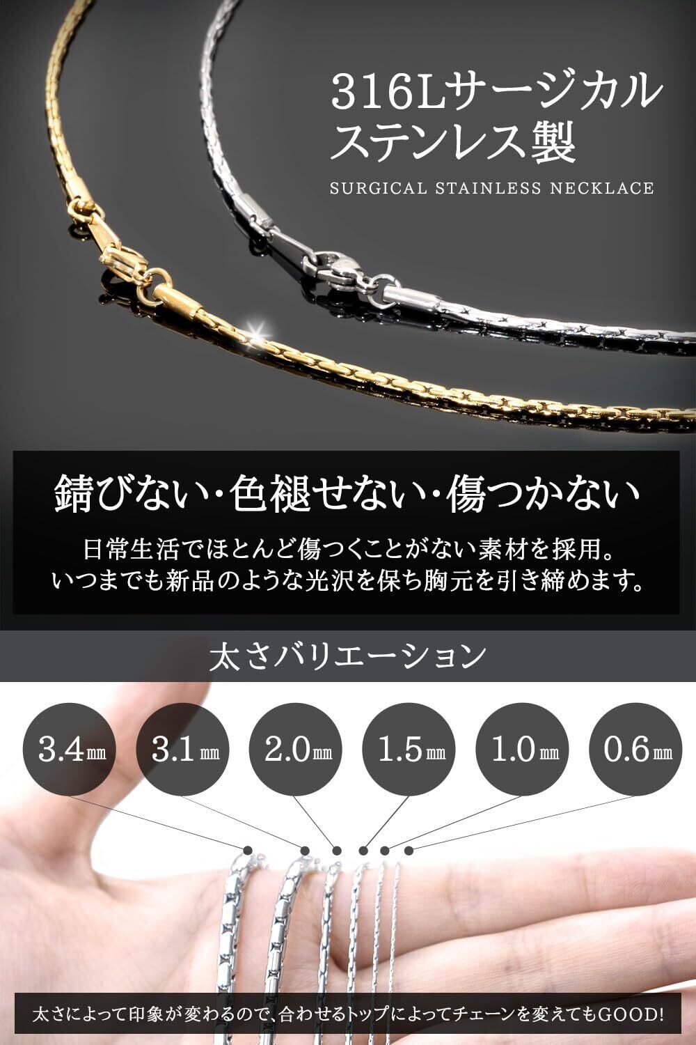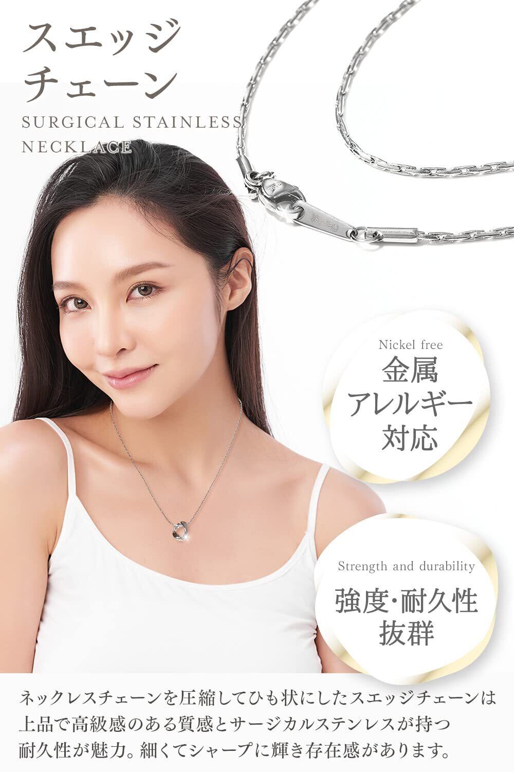 ステンレスチェーンで最も細い直径0.6mm!ネックレス チェーン を圧縮してひも状にしたスエッジチェーン! 上品 で 高級感 のある質感と サージカルステンレス が持つ 耐久性 。 カジュアル から フォーマル まで幅広く様々な ペンダント トップ に合わせていただけます。