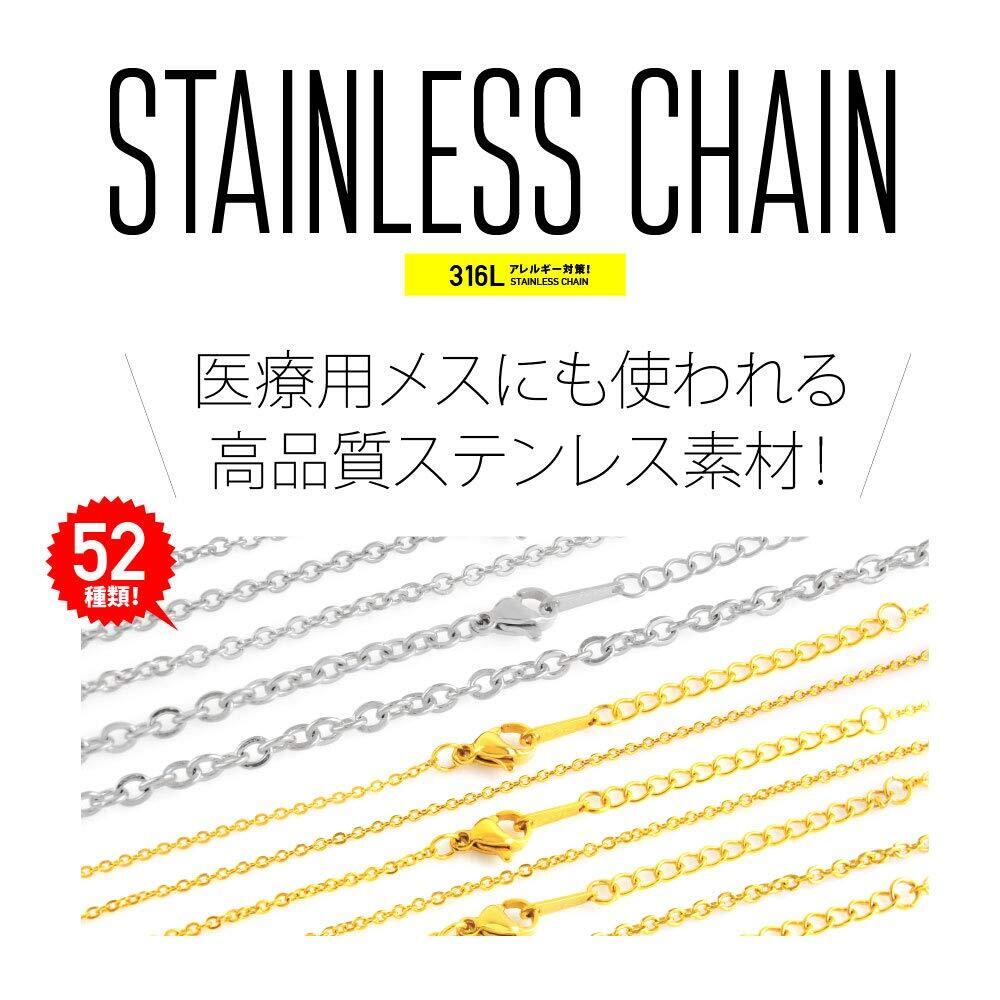 高品質で医療用メスなどにも使われる316Lサージカルステンレスを使用したステンレスチェーンです。同じペンダントトップでも季節や服装によって長めのチェーンが良かったり、短めのチェーンが良かったりと必要なチェーンの長さが違ってくることはよくあることですよね。しかもペンダントトップのデザインの違いで合うチェーンの太さも変わってくる。。。。いくつかのチェーンが欲しいところですが、同じようなチェーンを数本持つのにはそれなりの出費がかかる。。。。と困ることも多いチェーン選びですが、いろいろな長さと太さのバリエーションをご用意できました!チェーンのデザインはどんな服装にもトップのデザインにも合わせやすいアズキチェーンで、太さの種類は、1.2mmの極細サイズから1.5mm、2.0mm、2.5mm、そして太いサイズの3.0mmまでの種類。さらに!長さは女性のチョーカーサイズの40cmから45cm、50cm、60cm、70cm、そして男性でもかなり長めの80cmまで!またカラーもシルバーカラーとゴールドカラーをご用意。そのバリエーションの数はなんと!52種類にもなりました!この機会にぜひ、今足りないチェーンを手にしてください!