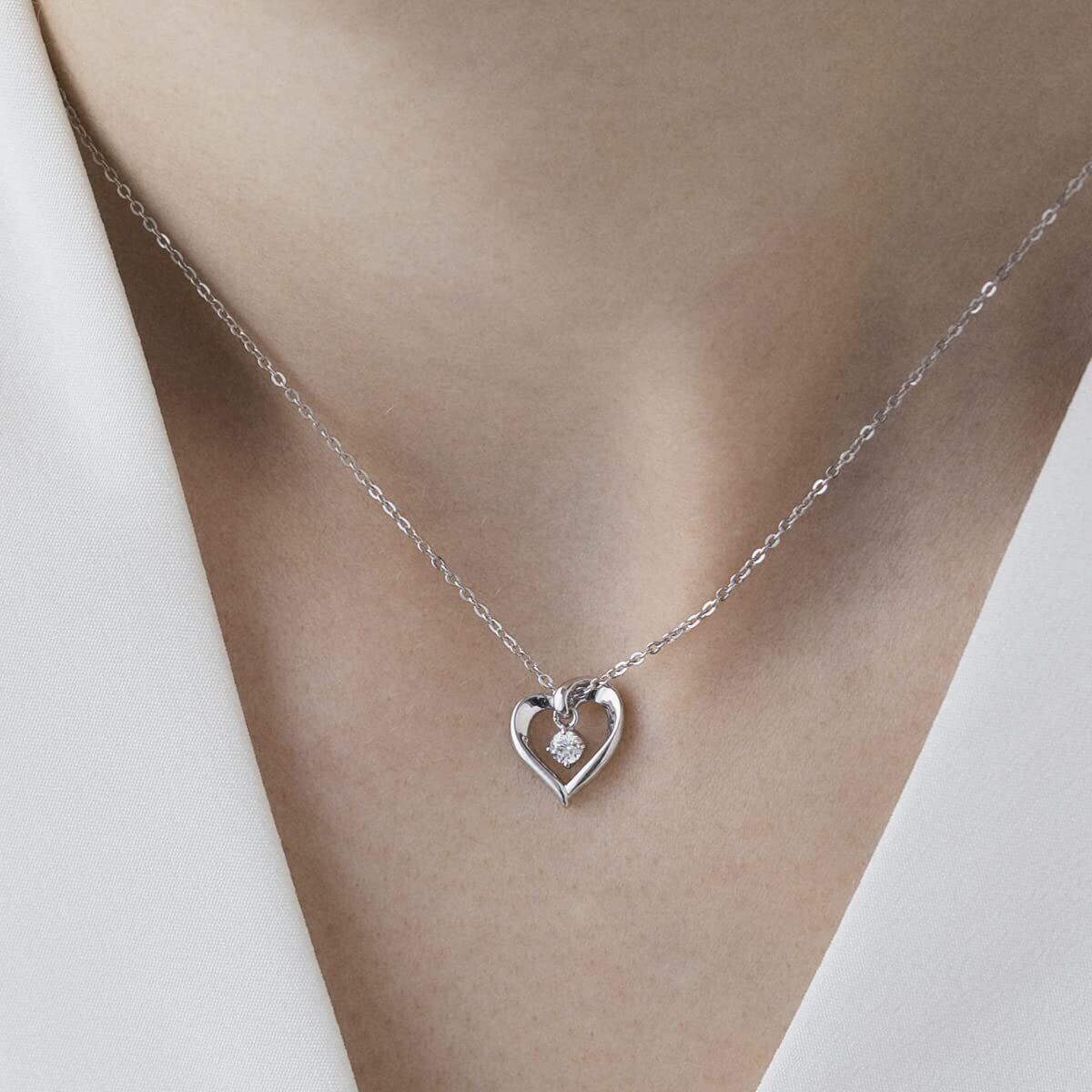 流れるようなラインが魅力的な、愛らしいハートモチーフのネックレス。キュービックジルコニアが揺れながら可憐にきらめきます。ロジウムコーティングの輝きも美しい、上品なデザインです。