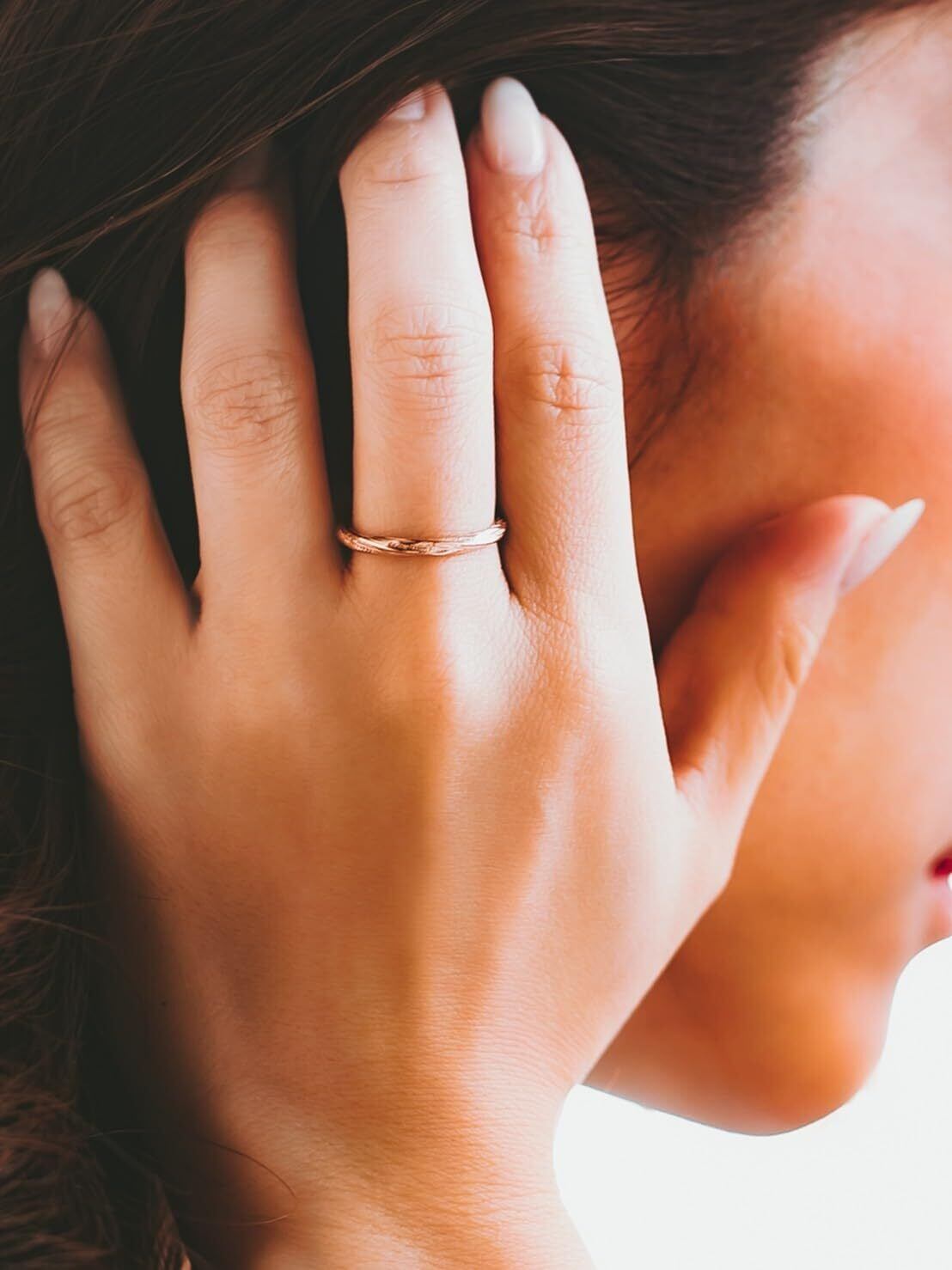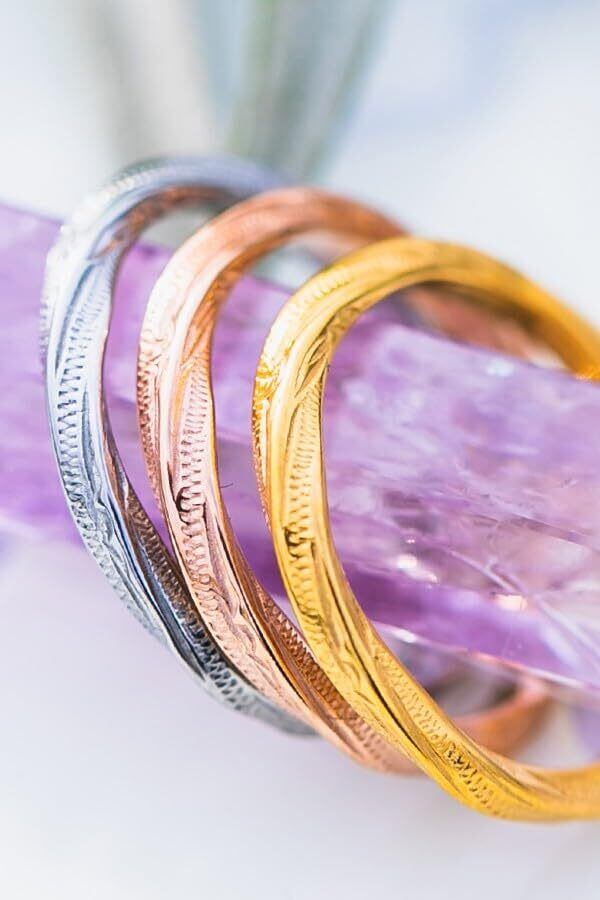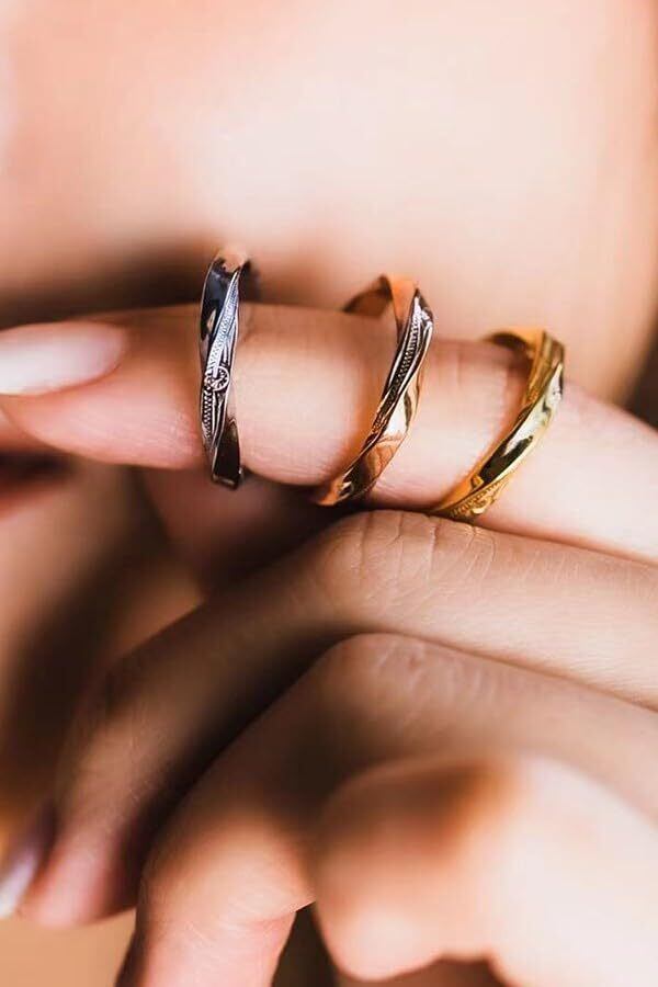 プルートゥリングのシャープな甲山リングをねじりあげて作り上げたステンレスリングです。全体がねじられたリングは、反射角度が通常のリングより多方面にあるため、輝きが周囲に差をつけます。