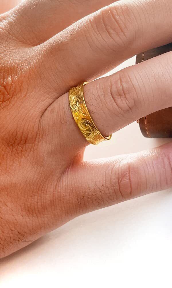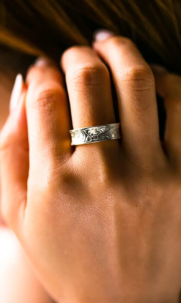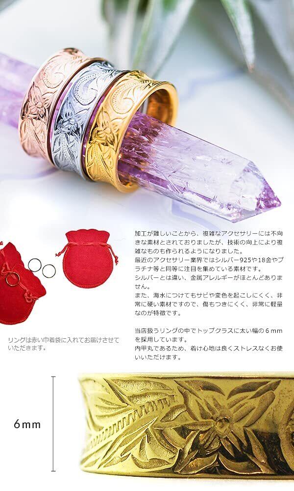 当店の扱うリングの中でトップクラスに太い幅の6mmを採用しています。内甲丸であるため、着け心地は良くストレスなくお使いいただけます。