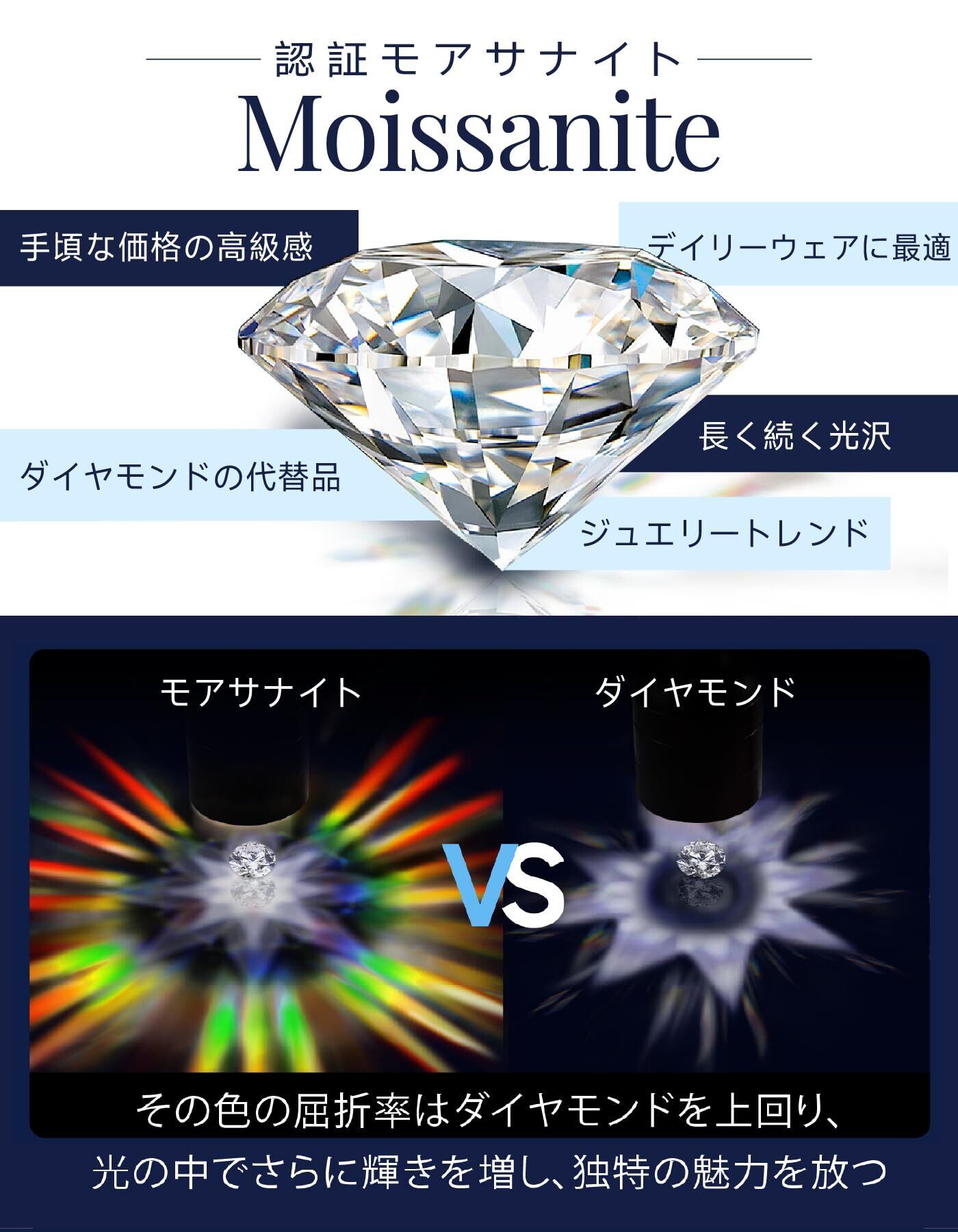 モアサナイトはラウンドカットで、Dカラー、VVS1クラリティの高品質な輝きを誇ります。