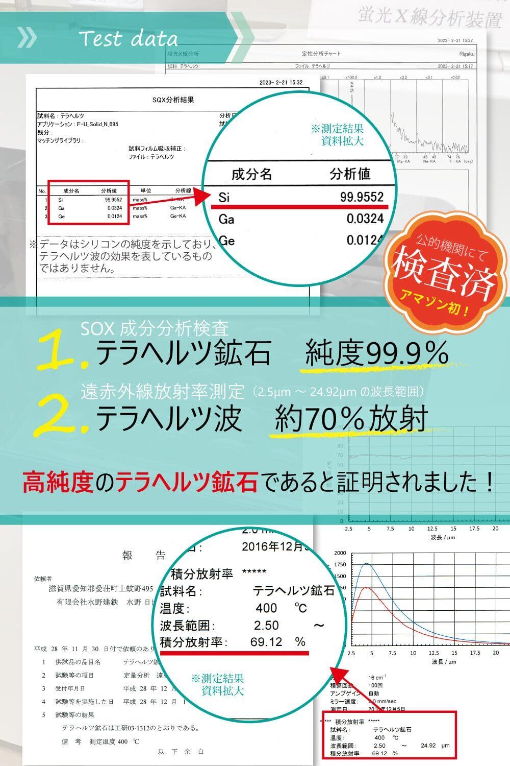 【公的機関で検査しました】偽物や低品質の安価なテラヘルツ鉱石も出回っておりますが、公的機関にて何度も検査し、テラヘルツ鉱石の純度約99%、テラヘルツ波の放射率70%を確認しております。皆様に安心して本物のテラヘルツ鉱石を体感して頂ければと思っております。