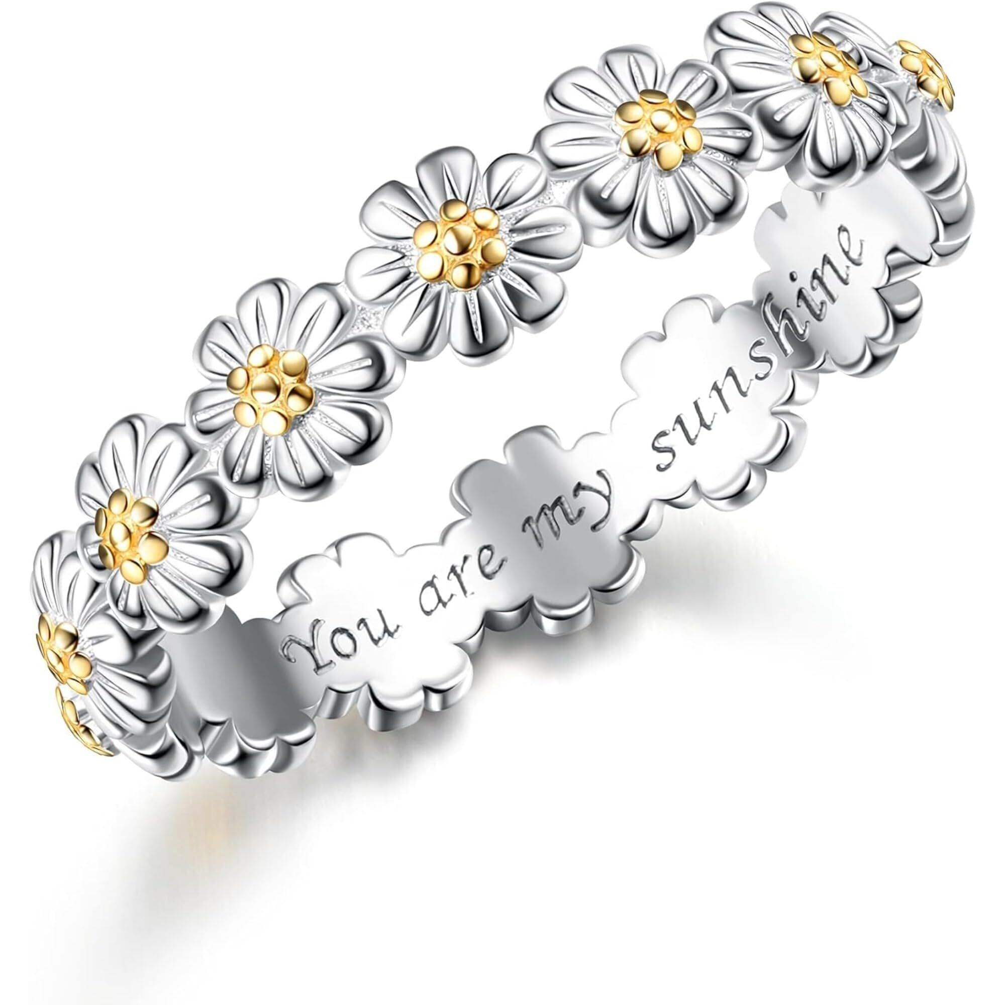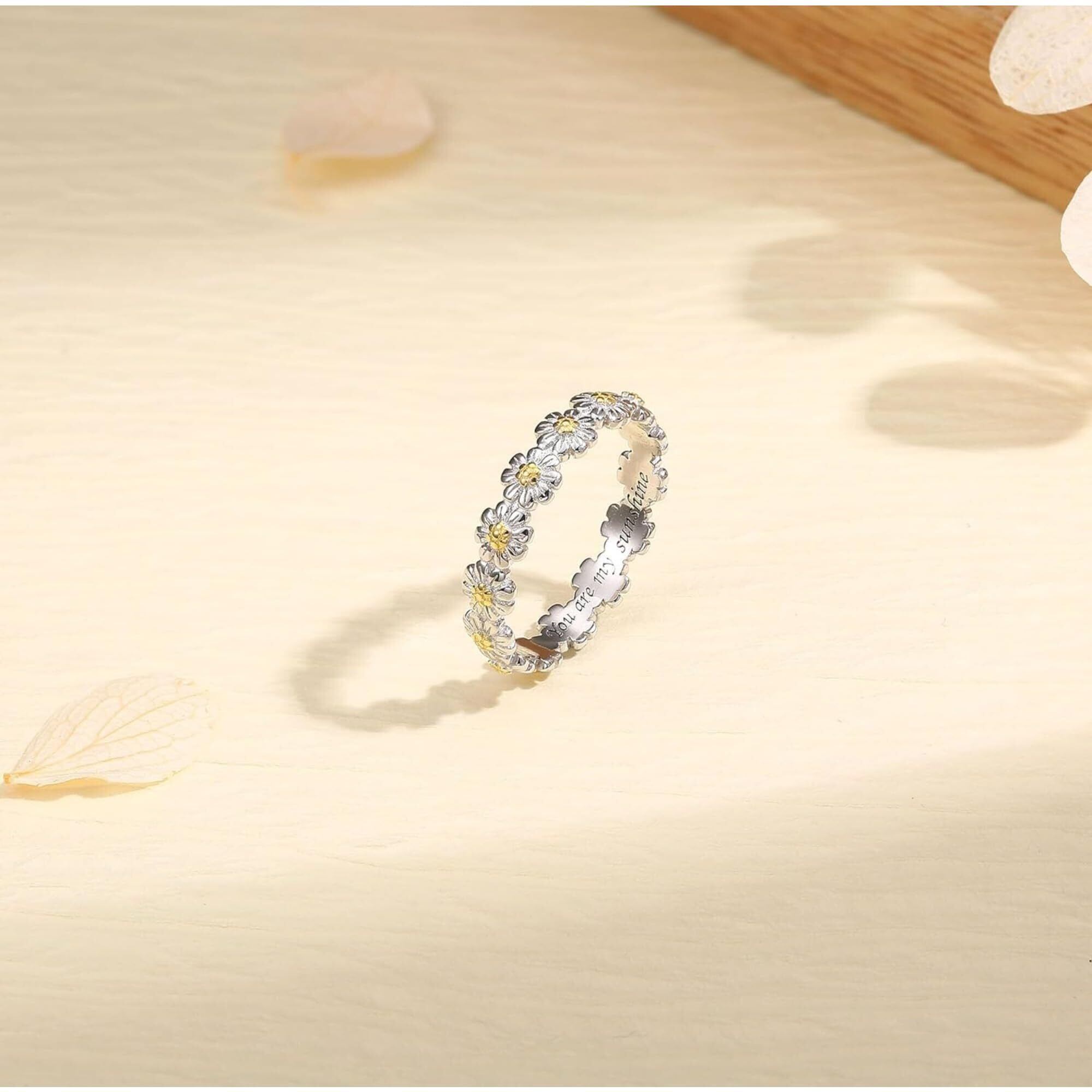 刻印されたフラワーリング バンドの中に隠された温かさと愛情のメッセージを発見してください。 「You Are My Sunshine」という心のこもった言葉が巧みに彫刻されており、デイジーの象徴と組み合わせて、温かさ、幸福、前向きさを意味し、愛する人への理想的な贈り物になります。