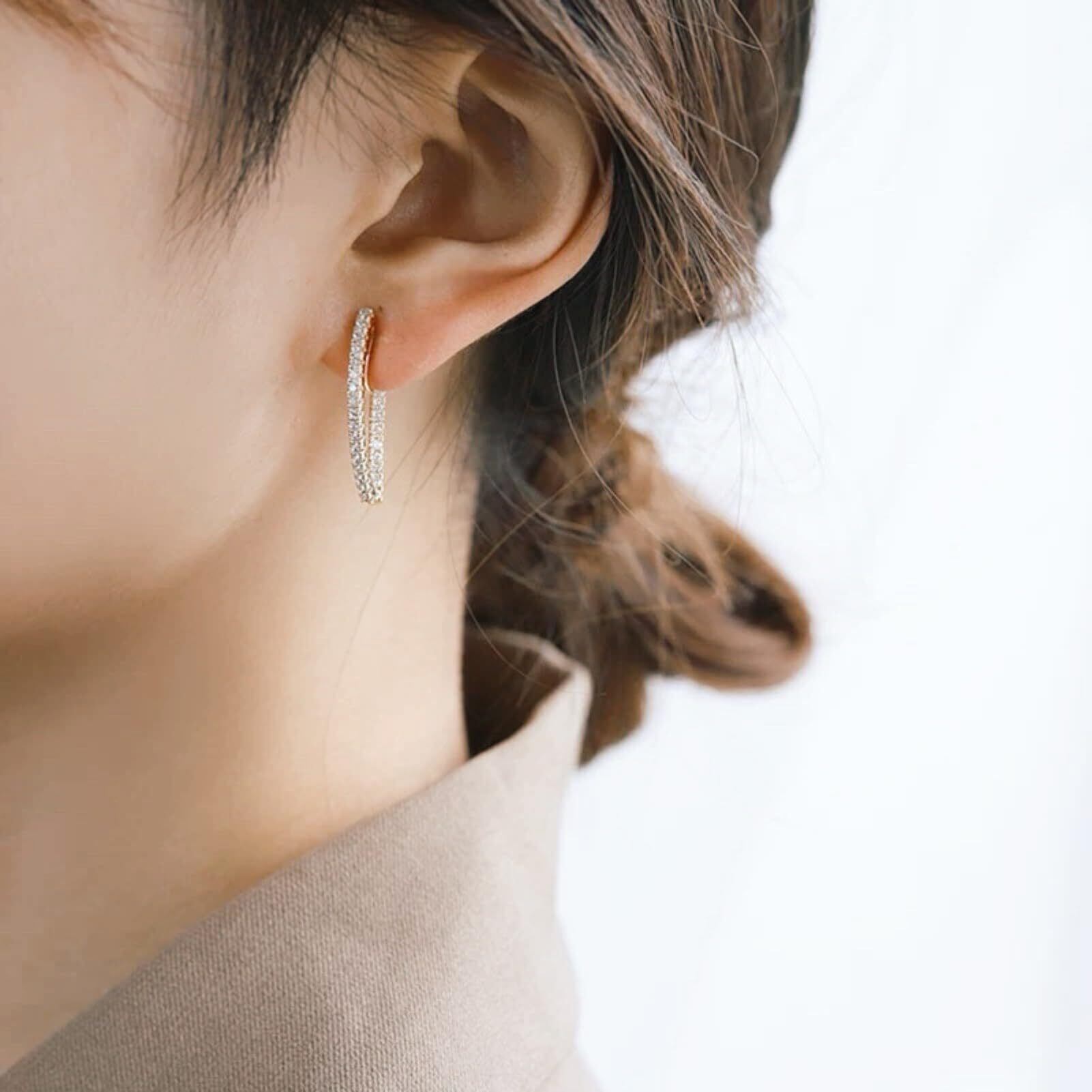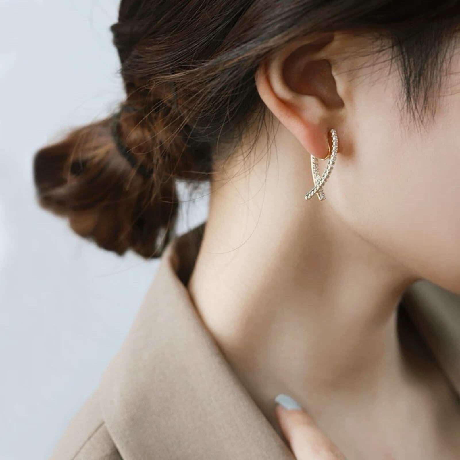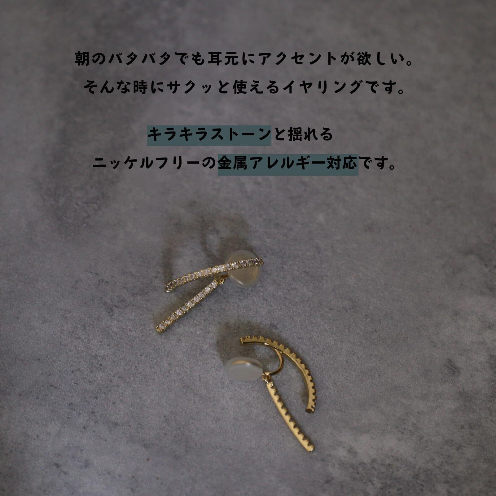 イヤリング金具を最小限に軽量化したことで、ストレスフリーな着け心地とピアスのようなルックスを実現