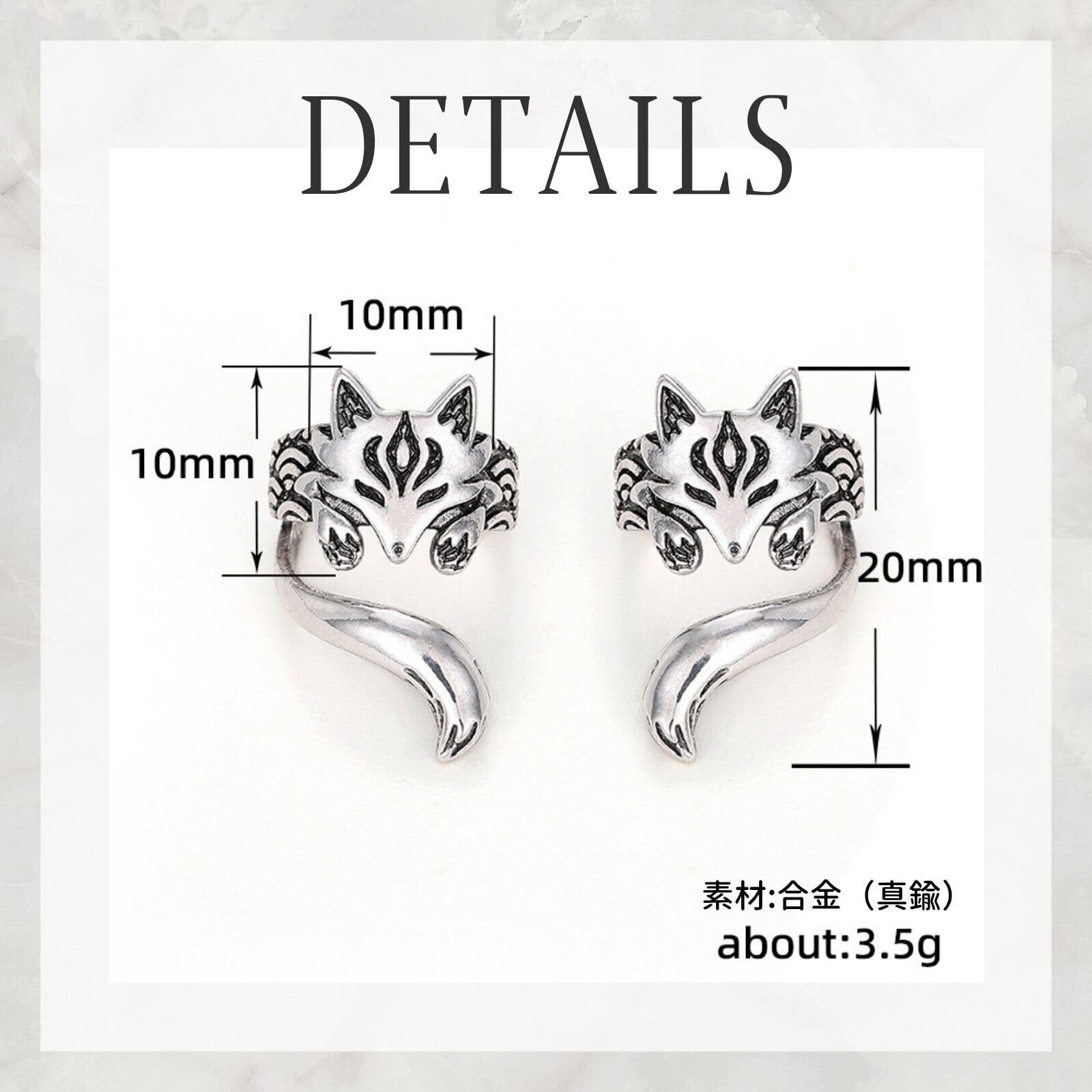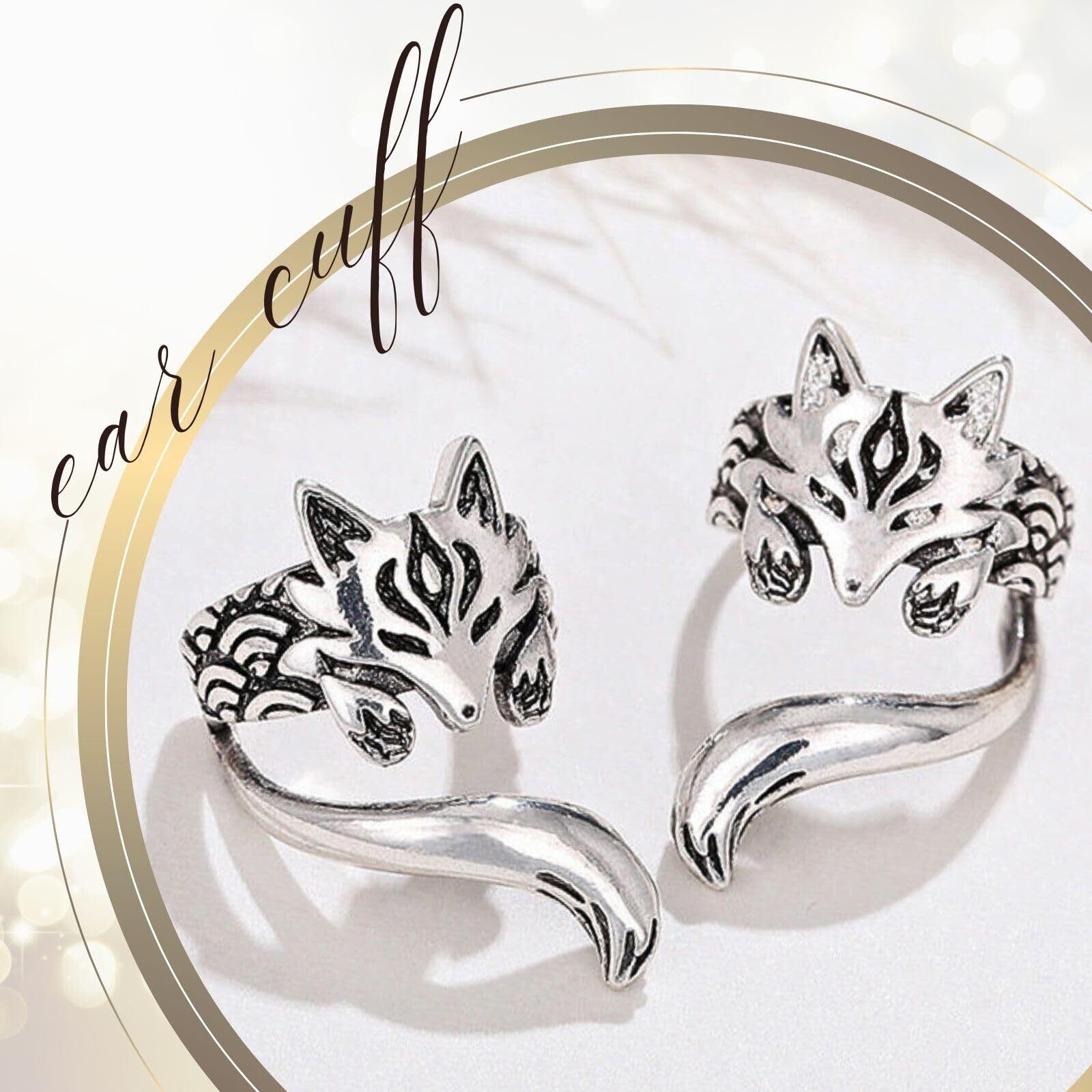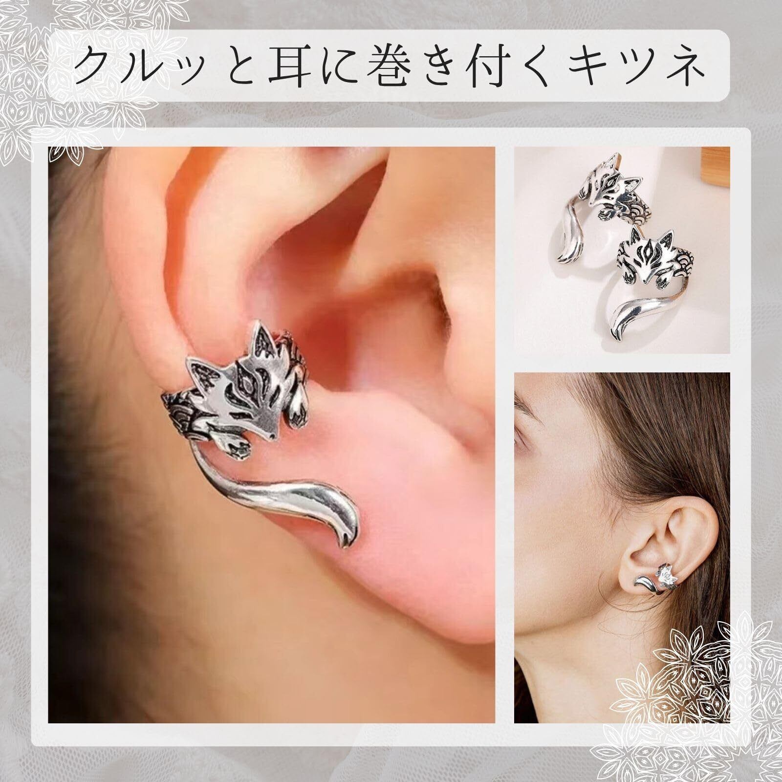 狐をモチーフにした左右ペアのイヤーカフセット。キツネが耳に巻き付くようなアニマルデザインで、ピアス穴不要のノンホールイヤリング。合金製でフープ型イヤーフック。男女問わず楽しめるユニセックスなアクセサリーです。