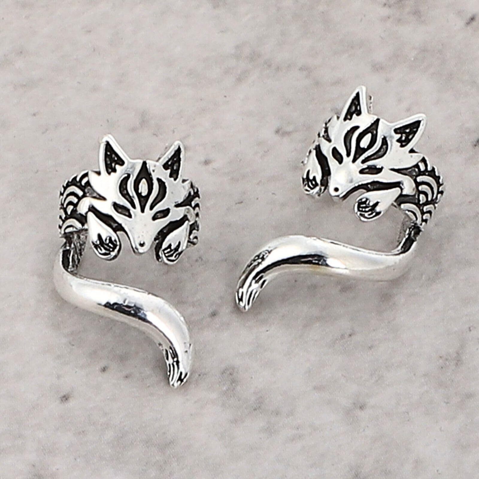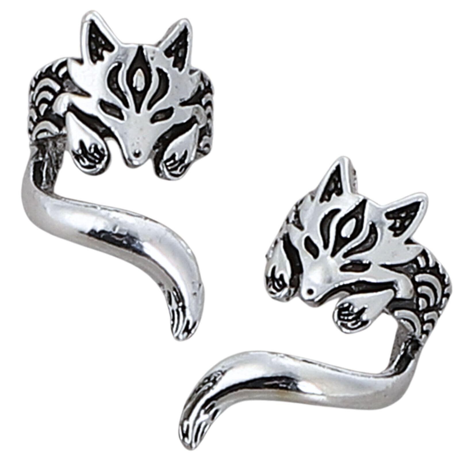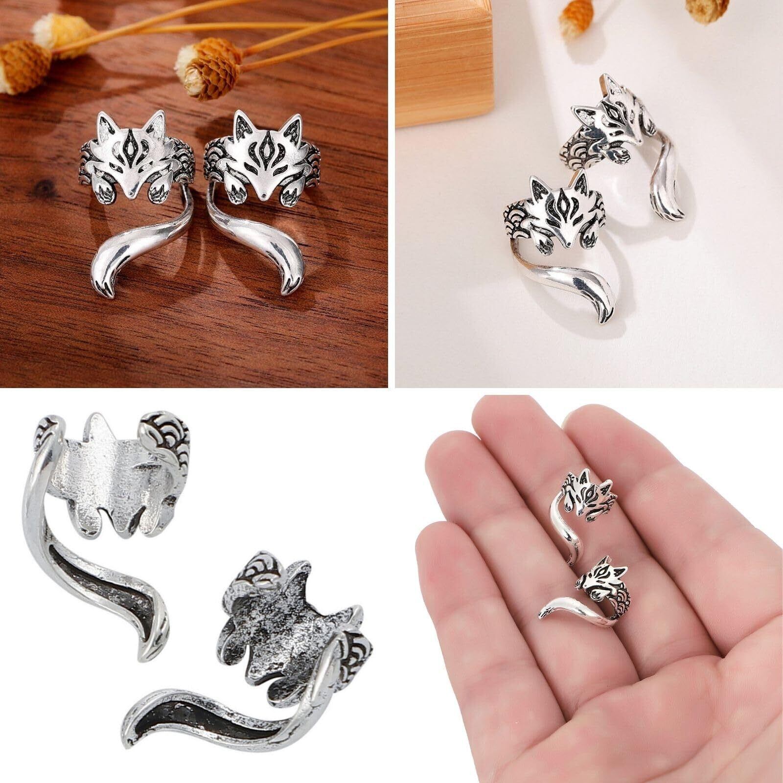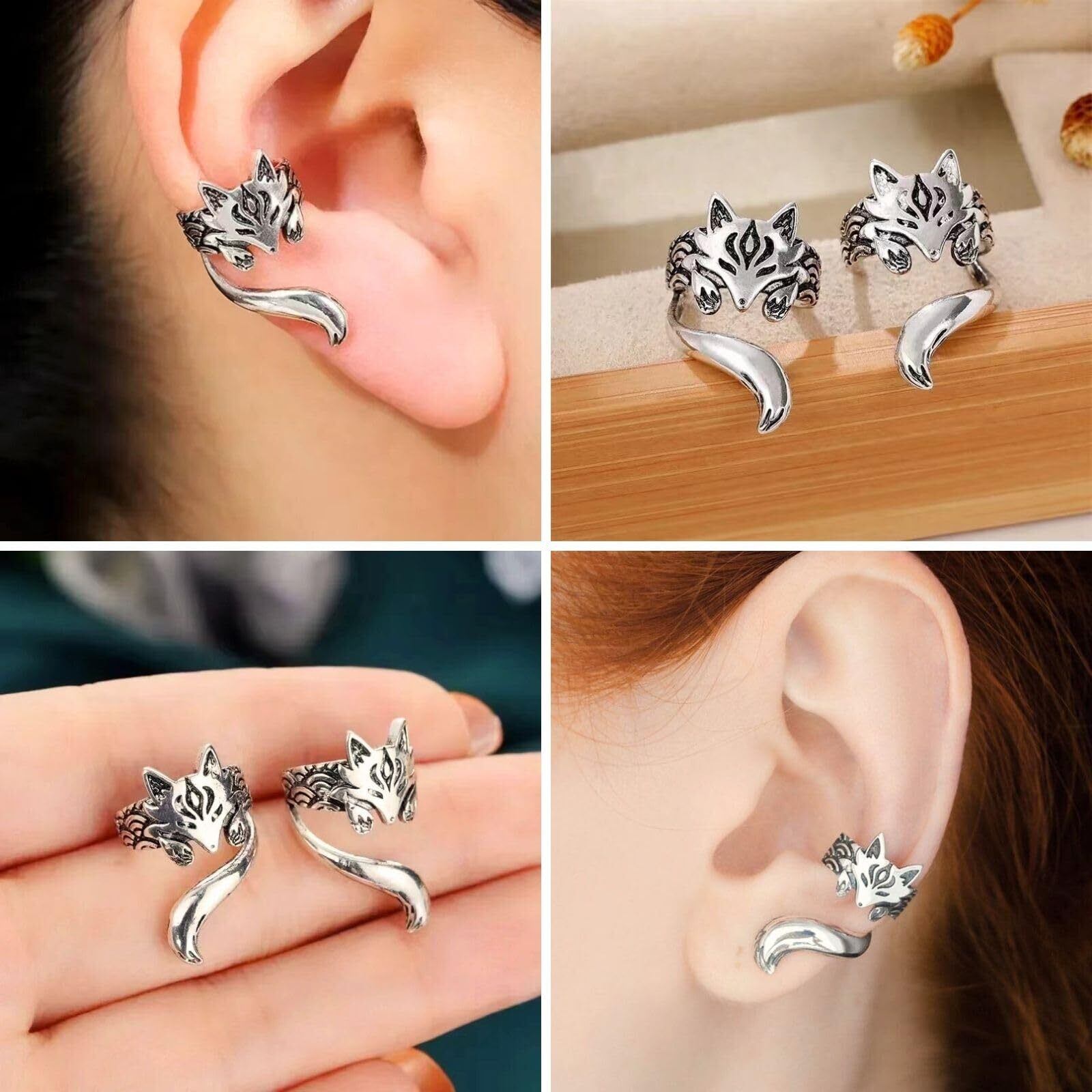 狐をモチーフにした左右ペアのイヤーカフセット。キツネが耳に巻き付くようなアニマルデザインで、ピアス穴不要のノンホールイヤリング。合金製でフープ型イヤーフック。男女問わず楽しめるユニセックスなアクセサリーです。