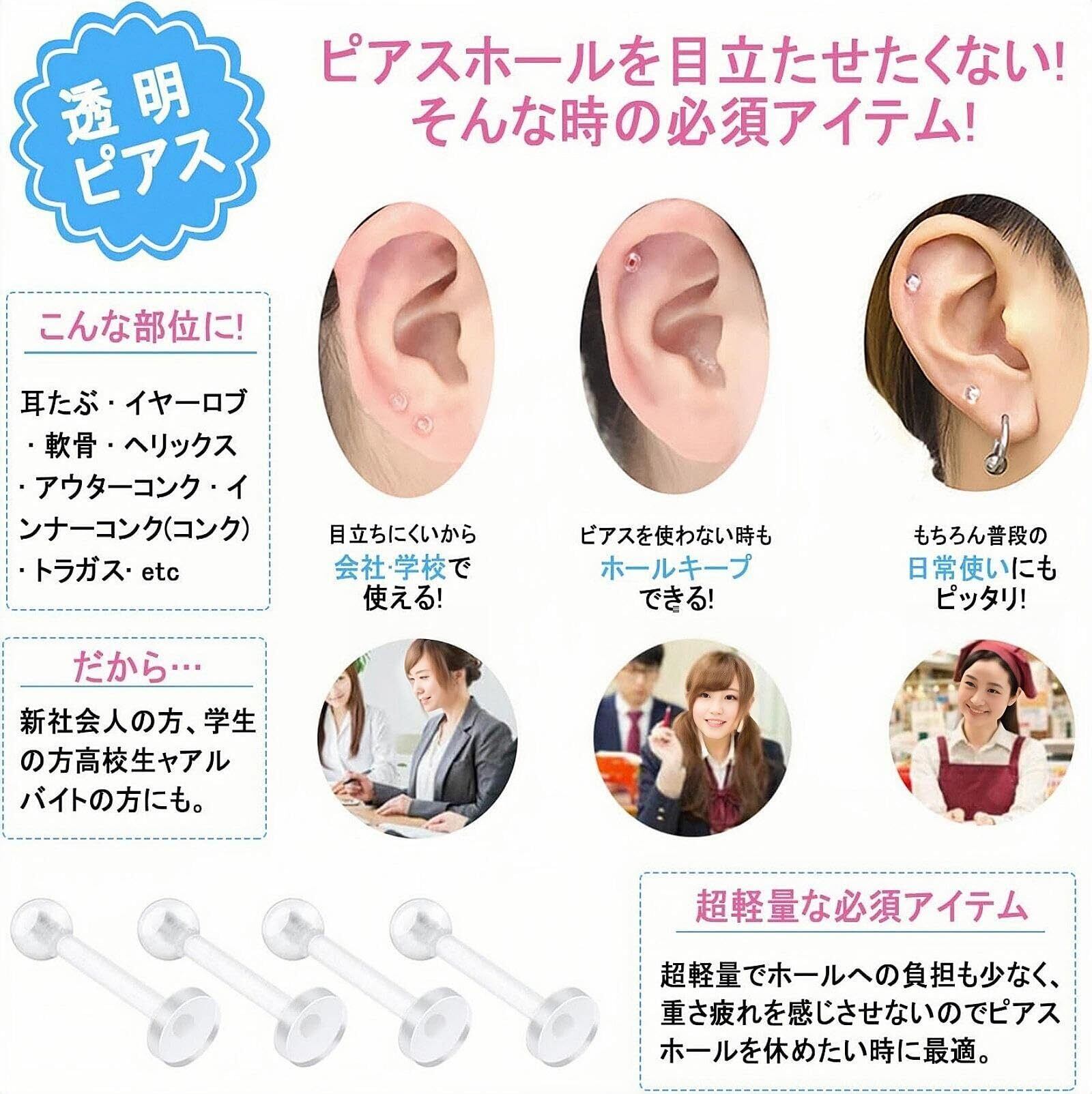 【透明で目立たず】:職場オフィスや面接、学校などでピアスを目立たせたくない場合にしっかりとピアスホールを維持できる透明ピアス。バレずにホールをキープしたい方におススメ!
