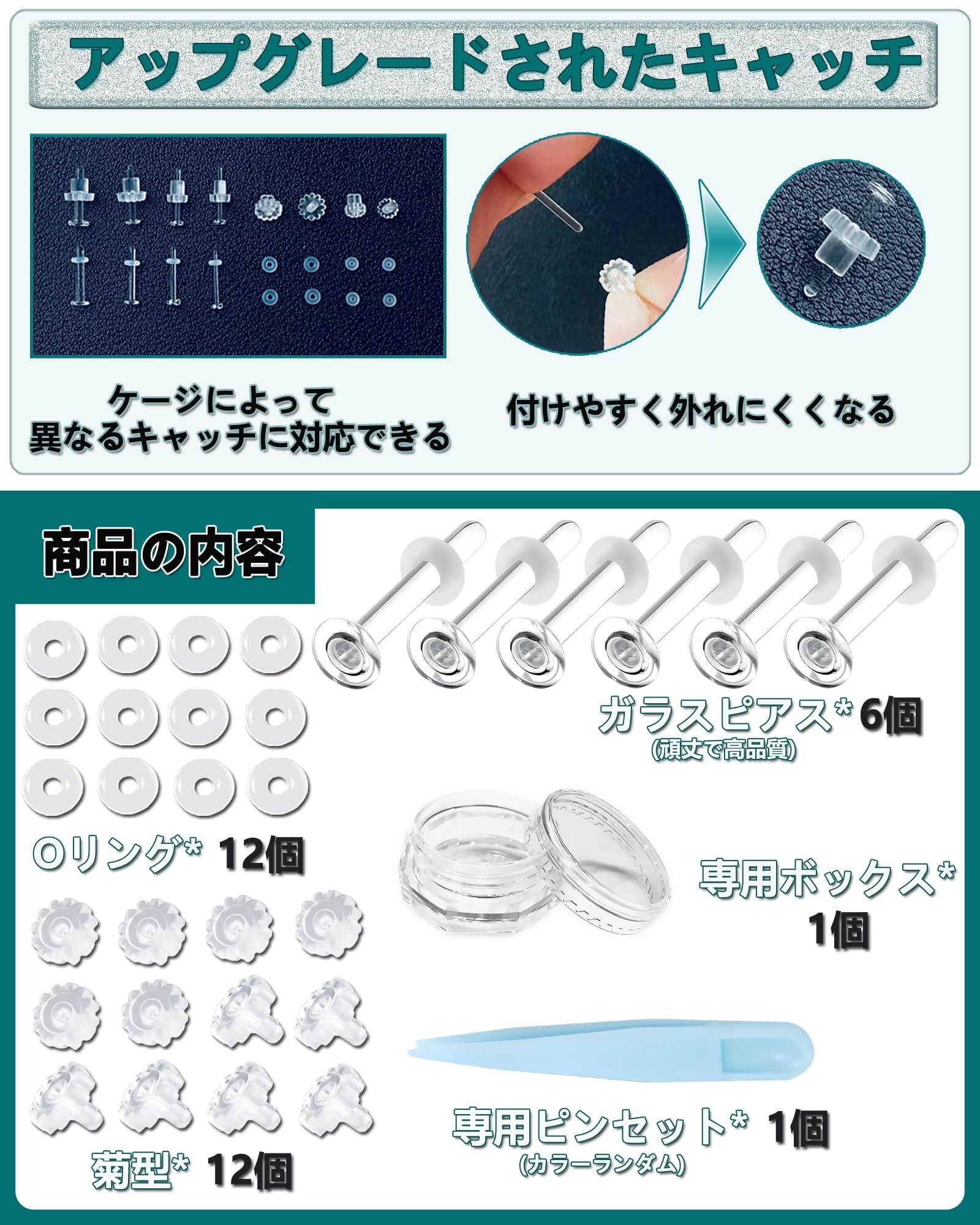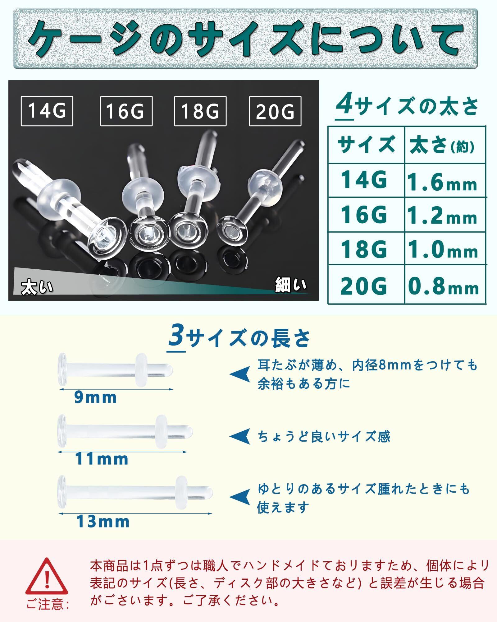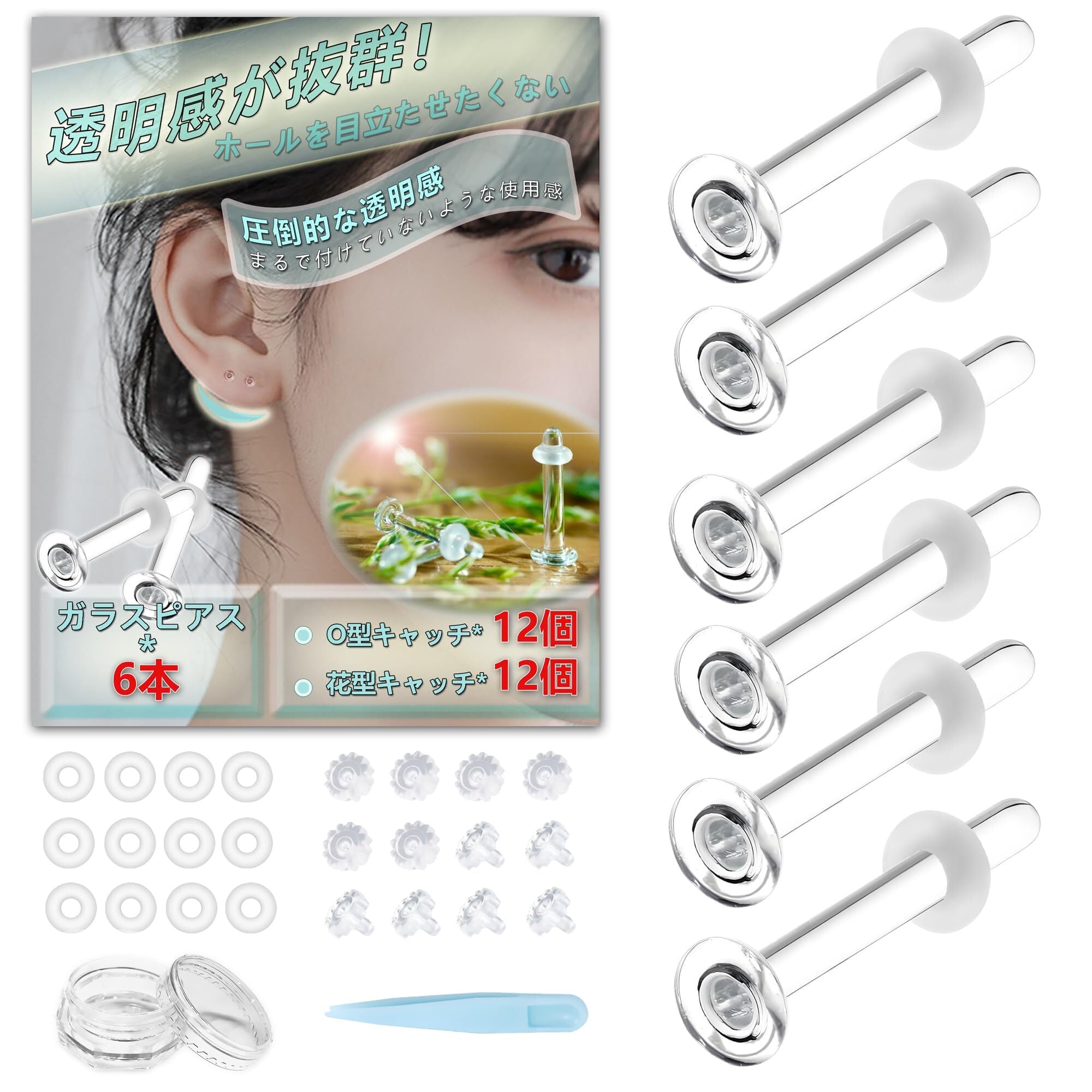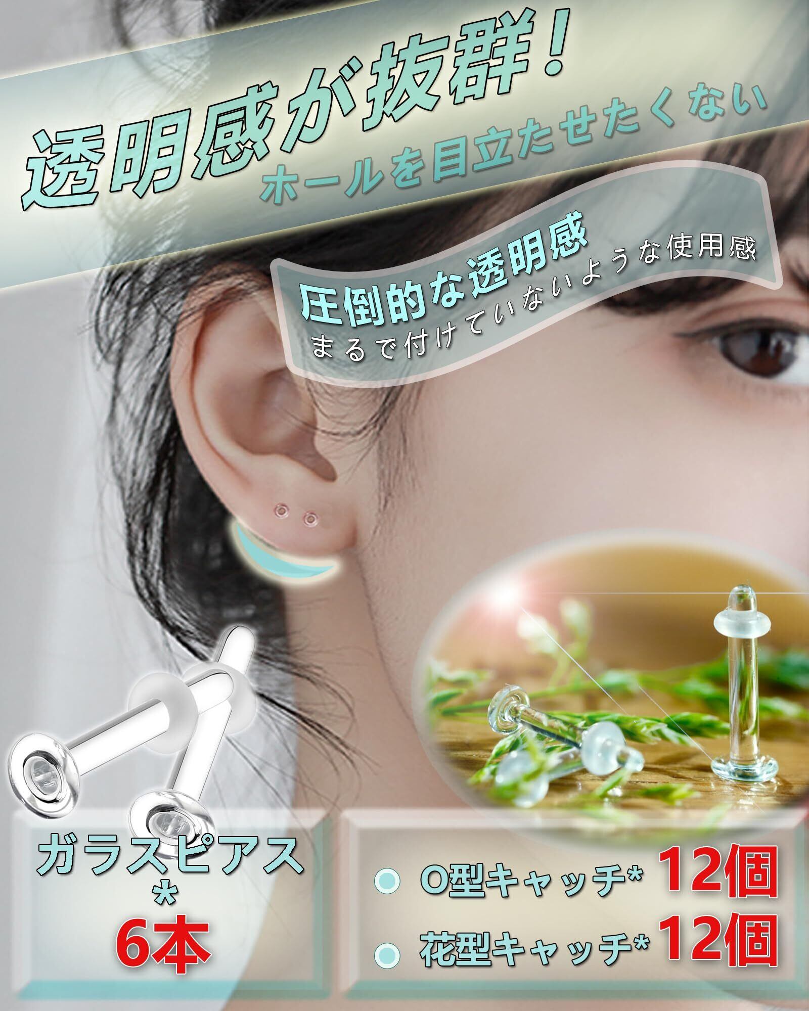【内容&選べるサイズ】内容:6本ガラスピアス + 16個Oリングキャッチ + 16個花型キャッチ +1個収納ケース+ピンセット ※太さ(ゲージサイズ)太さ(20G=0.8mm/*18G=1mm/16G=1.2mm/14G=1.6mm)の4サイズ、全長9mm/11mm/13mmの3種、透明ガラスピアスセット販売になりますので、お好きなゲージサイズや全長やタイプを確認してご購入ください。シンプルなデザイン、つけっぱなしにできる事もあり、メンズ・レディースを問わずお使い頂くお客さんが多くいらっしゃいます。強化ガラスを使用した透明で目立ちにくいピアスです。