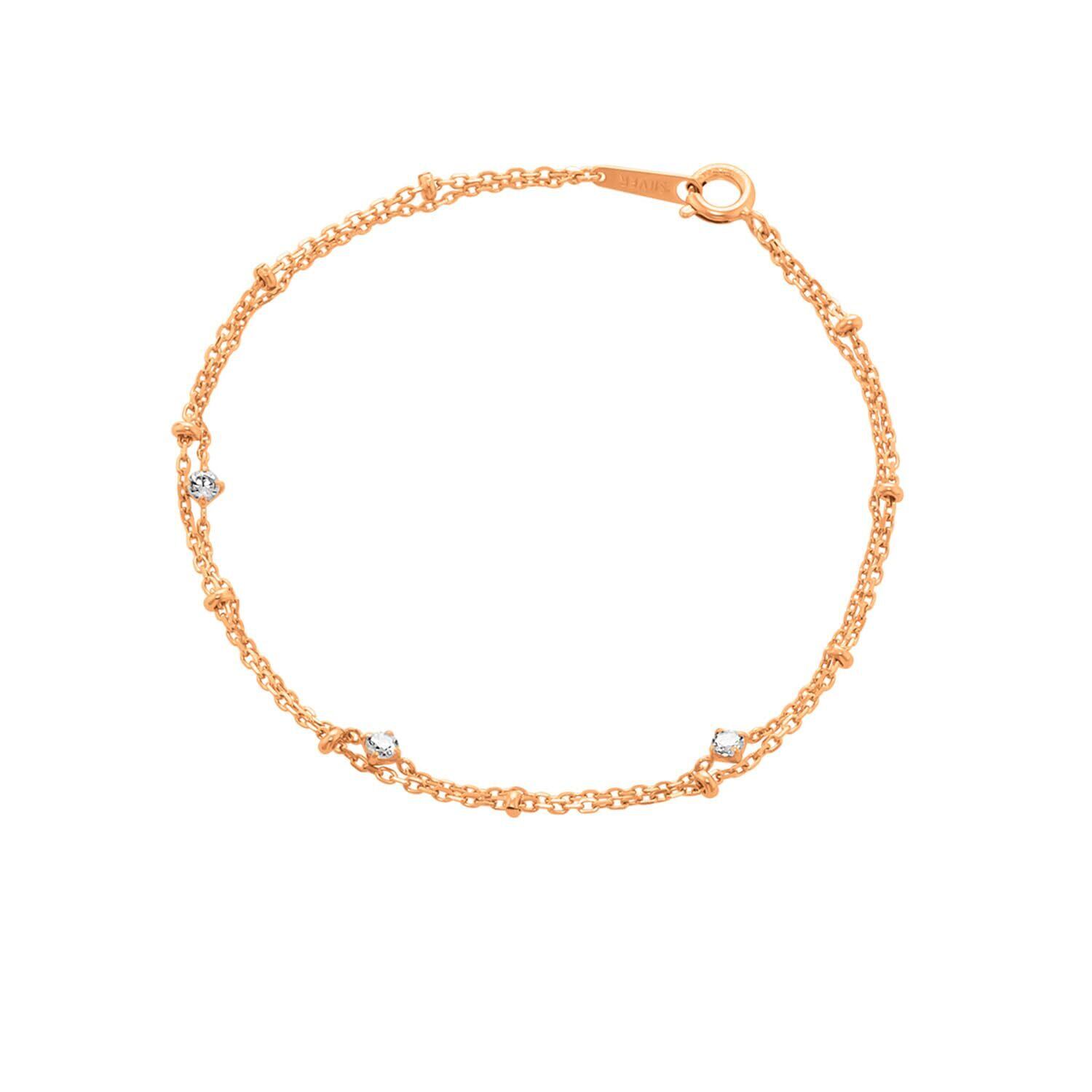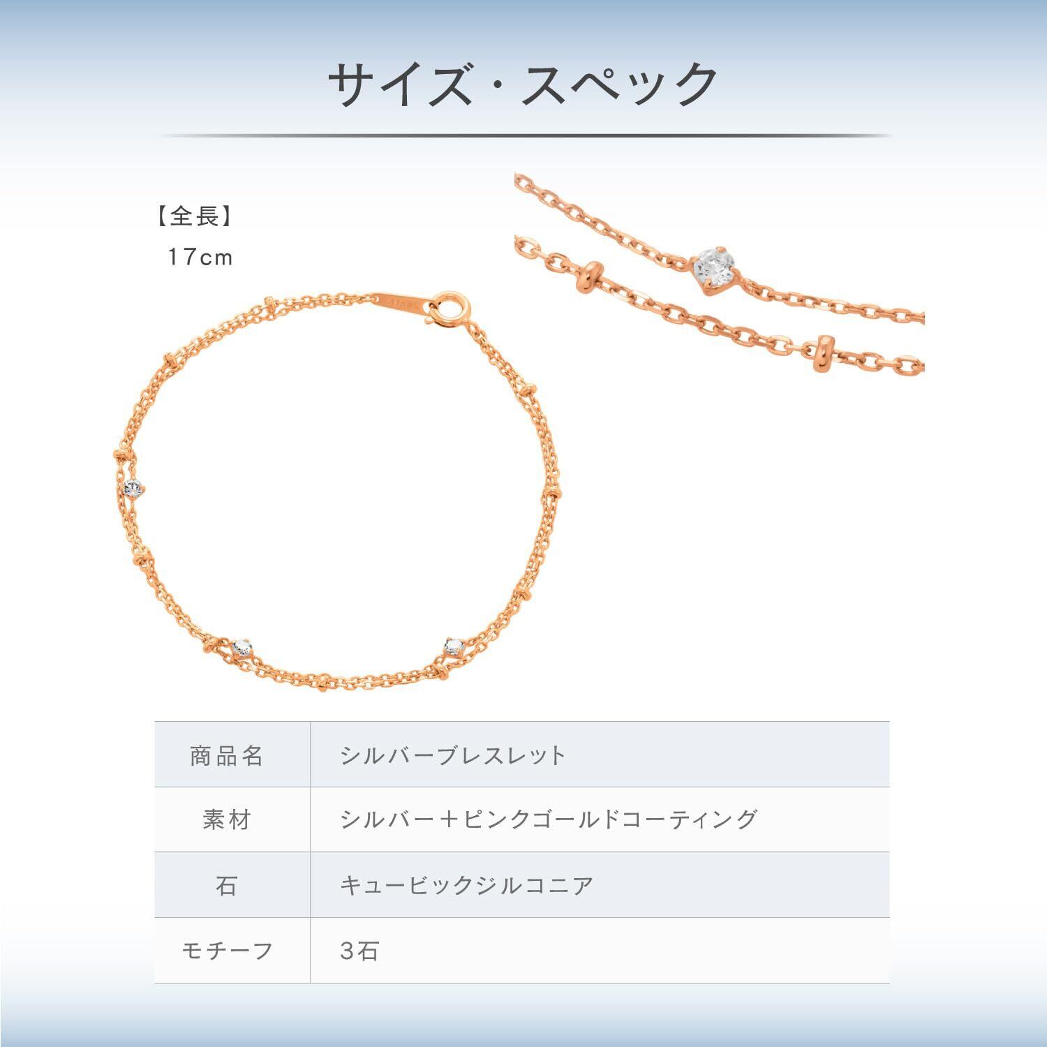 手元を華やかに演出する2連ブレスレット。肌に馴染むピンクゴールドコーティングの優しい色合いも魅力です。眩い輝きを放つキュービックジルコニアを添えた、女性らしさを引き立てるデザインです。