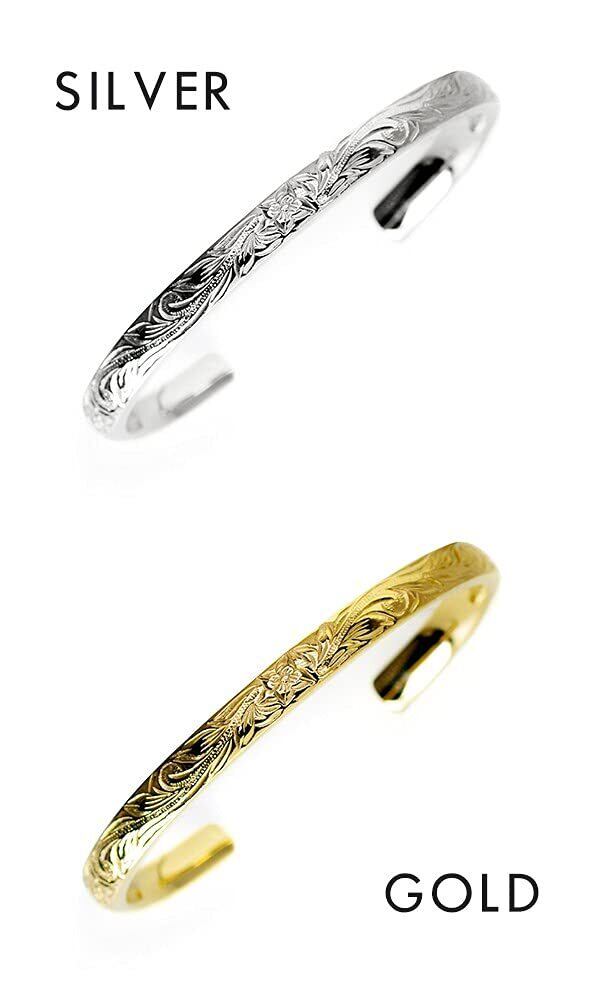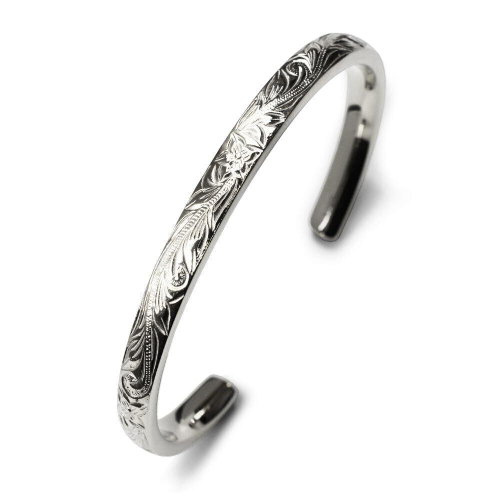 美しい彫柄を施し、サージカルステンレス製のハワイアンテイストを取り入れたバングルです。 プルメリアは神の宿る神聖な花とも言われ、プルメリアを身に着けると魅力が高まるといわれています。 ハワイアンジュエリーならではの神秘的なお守りとしてデイリーアクセサリーとしてお使いいただけます。 サージカルステンレスとは医療用ステンレスの意味です。 200種類を超えるステンレスの中でもアレルギー性の極めて低い素材で、金属アレルギーを起こしにくく、人体にとても優しい素材であることから、医療用工具のメスやハサミ等に使用されている素材です。 重厚感があるように厚みと幅を十分もたすよう設計しています。 サイズは幅5.5mm、厚さは3.5mmで作り上げていますが、素材の特性を活かし重さは18グラムと軽量に仕上がっています。 ■素材:サージカルステンレス(316L) ■サイズ ・内径44mm×55.5mm、幅:5.5mm、厚み:3.5mm、重さ18g ・開口部:25.0mm ・腕周り:155mm ■カラー:シルバー・ゴールド<■バングルの調節方法 ・バングルはサイズの微調整が可能です。丁寧にバングルを締める、または広げてください。 但し、1度以上のサイズ調整は行わないようにしてください。 ※注意 ・当店ではサイズ調整はお断りしております。 ・刻印サービスは現在行っておりません。