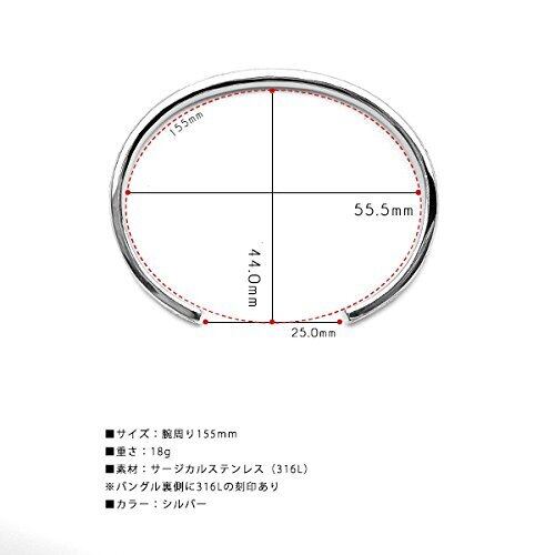 素材:サージカルステンレス(316L) ■サイズ:内径44mm×55.5mm 幅:5.5mm 厚み:3.5mm 重さ18g 開口部:25.0mm 腕周り:155mm