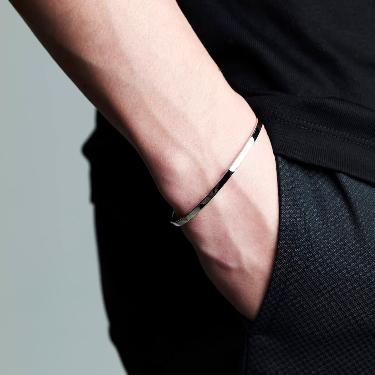 【Basic Bangle】さりげないアクセントを手元にプラスする、3mm幅のシンプルなMサイズ(内周約15cm)のバングル。地金だけの飾りのないミニマルなデザインで、時計やブレスレットとのコーディネートにもおすすめ。スタイルを選ばずに合わせられる、プレーンな仕上がりが魅力的なアイテム。シルバー950にプラチナコーティングを施し、上質感のある地金の輝きをプラスしています。