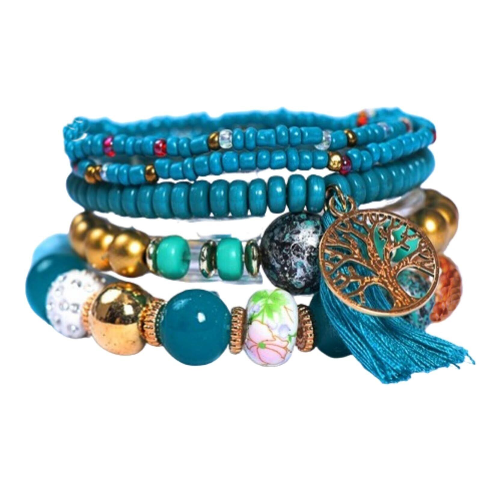 ターコイズカラーがきれいで、目を惹く、異素材パーツのデザインが特徴のブレスレットは手首まわりをおしゃれに可愛くしてくれるアイテムです。