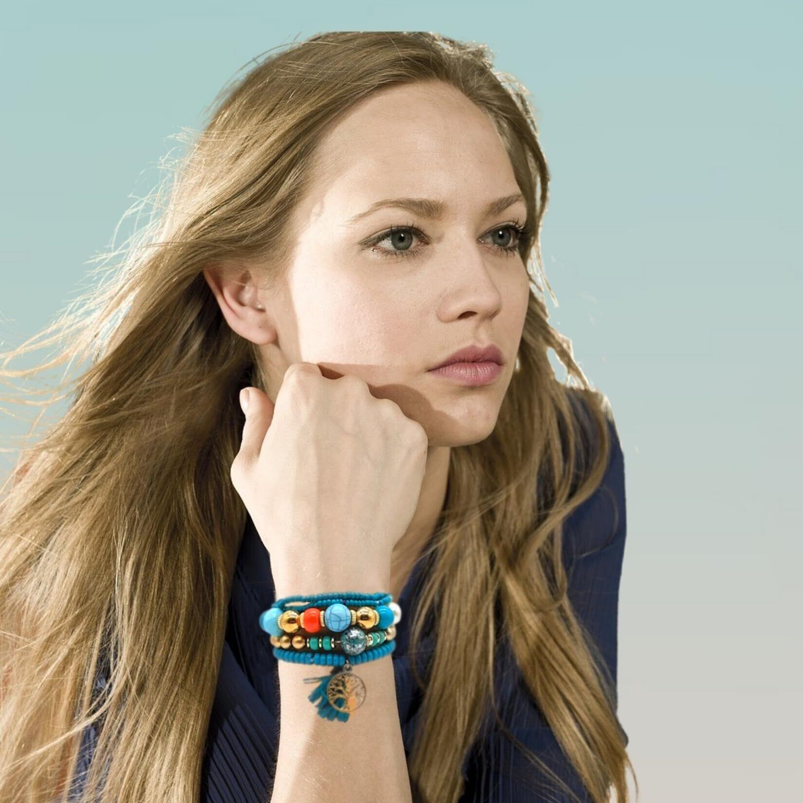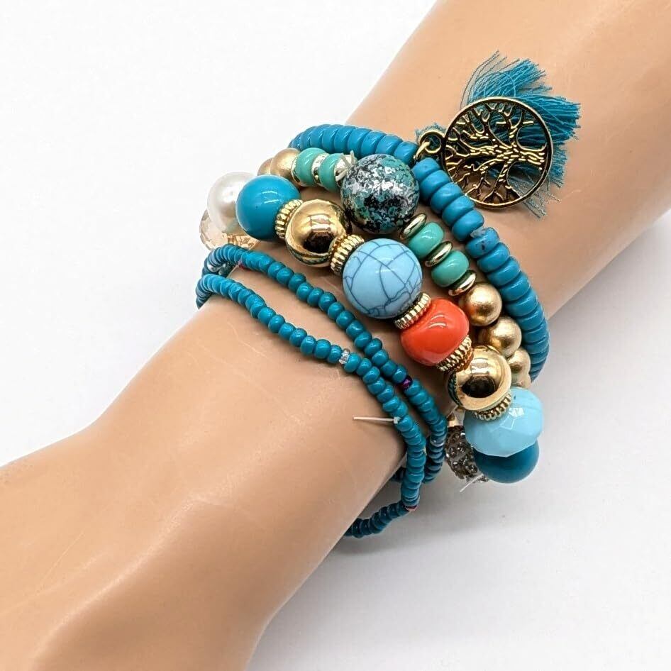 異素材を組み合わせたブレスレットは石が重なるデザインだから手首のドレスアップにしっかりとアピール!鮮やかで、きれいなターコイズブルーで気分も上がります!