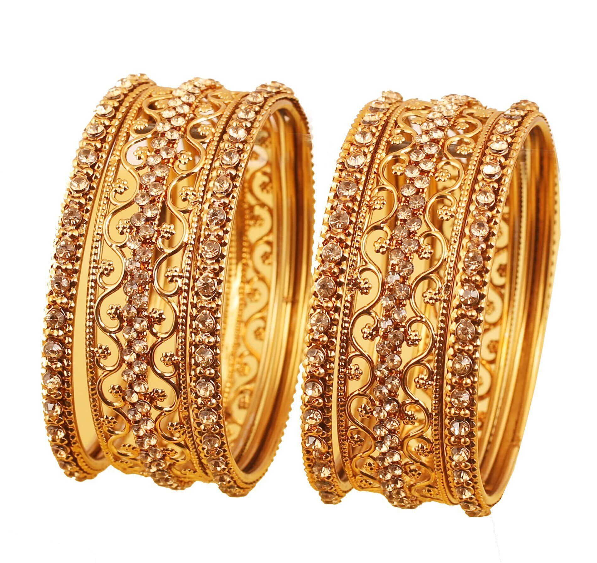 試金石「ゴールデンバングルコレクション」インドボリウッドエキゾチックフィリグリーと穀物作業クリアラインストーン厚手の薄いバングルブレスレットは女性のためのアンティークゴールドトーンの中にあります。 6のセット。