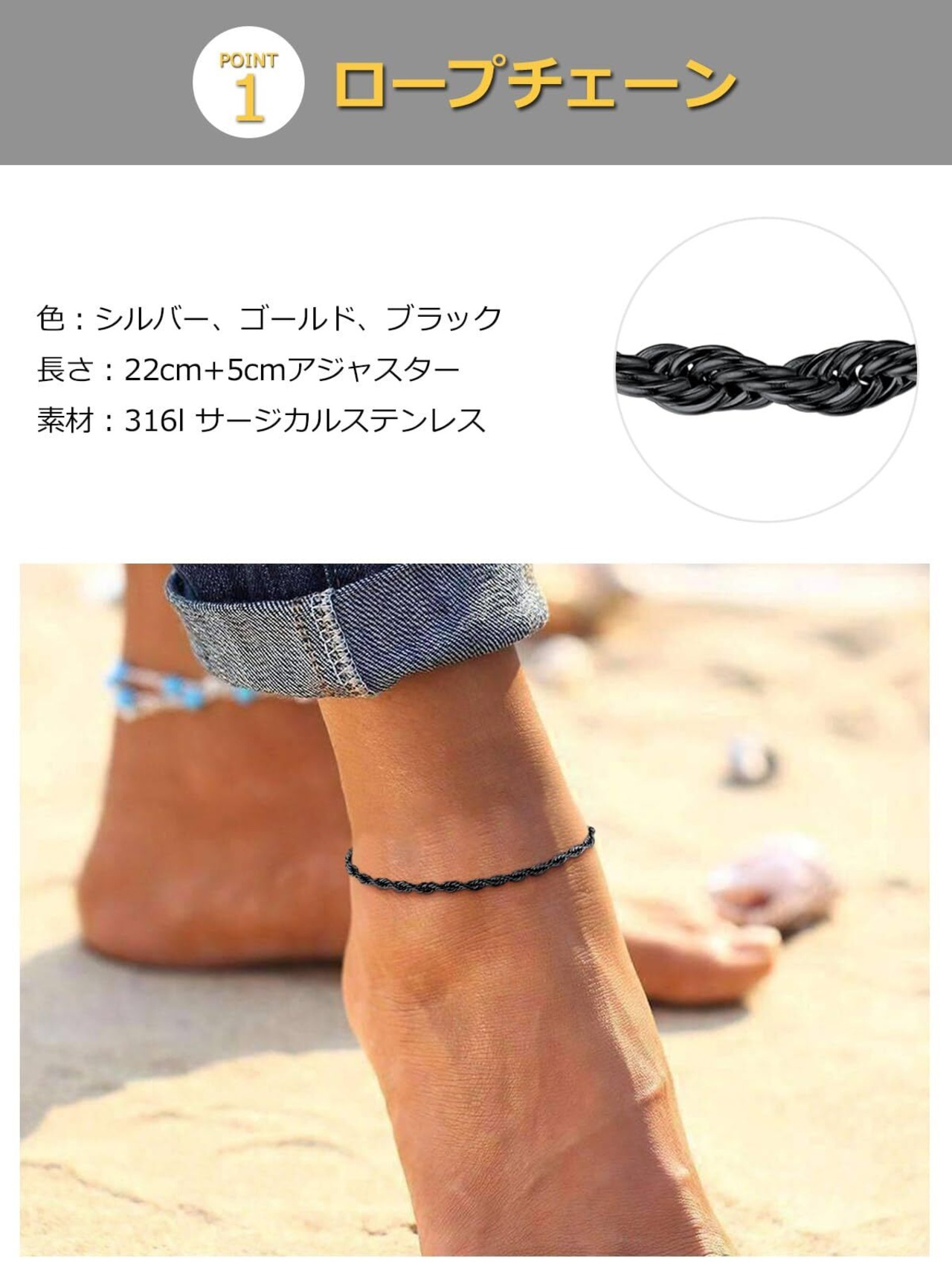 【サイズ調節可能】長さは22cm+アジャスター5cmです。アンクレットを短くしたい時は引き輪を丸カンに通して調節できます。また、幅は3mmぐらい、細も過ぎず、男女を問わず、フィット感よく付けられ、大人らしいラグジュアリー感を演出してくれます。
