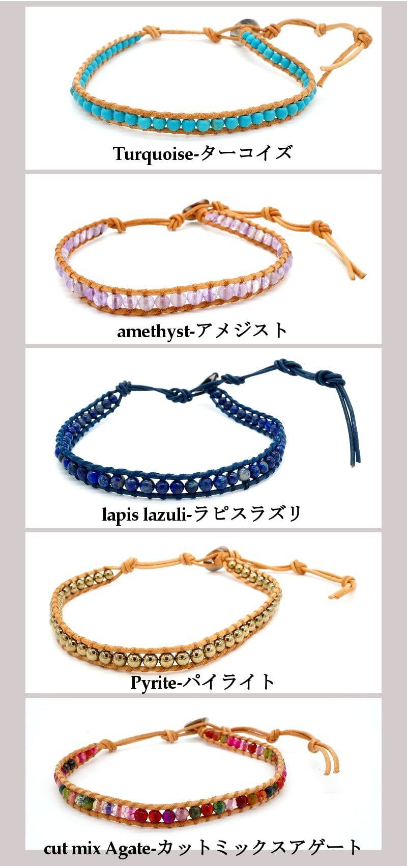 素材 | ターコイズ/アメジスト/ラピスラズリ/パイライト/カットミックスアゲート/牛革紐 サイズ | 幅:約7mm 着用可能サイズ:約21cm~32cm 石サイズ | 約4mm