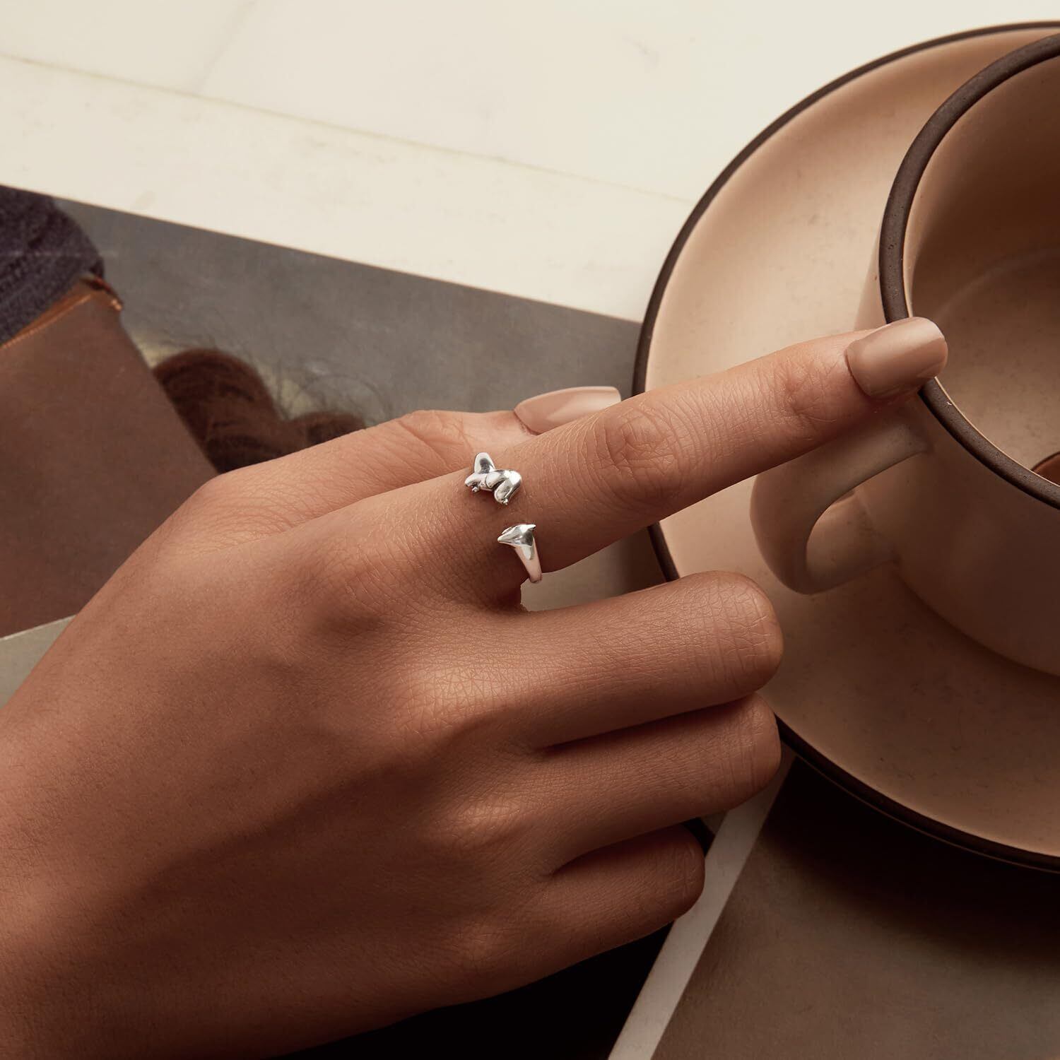 【ダックスフンドリング】 ダックスフンドをモチーフにしたユニークなデザインのリング。開口部の形状で調整可能なため、指のサイズにぴったりフィットします。
