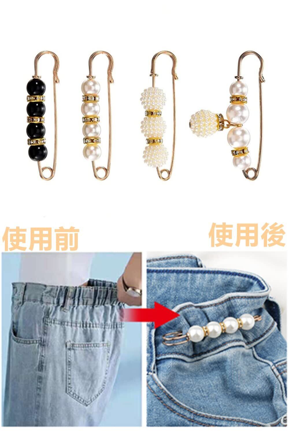 【簡単取り付け】ウエストバックル ピンは使い易い、とても便利し綺麗です。①対象のズボンをつまんでサイズを調整します。②つまんだ箇所をバックルピンで留めれば完成です。