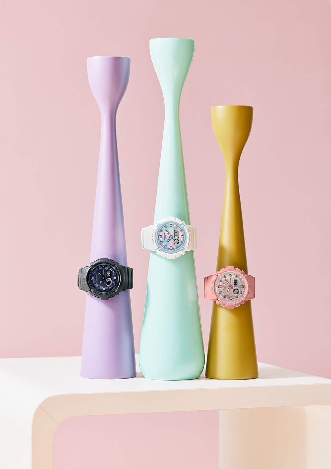 アクティブな女性のためのカジュアルウオッチBABY-Gから、丸みのあるシルエットが特徴のシリーズの登場です。新型BGA-280は、パーツを重ねた多層構造のケースデザインを採用し、カラフルな仕上げが特徴のシリーズです。ラウンド型ケースでキュートな印象ながらボリューム感のあるフォルムに、メタリックのインデックスでスポーティなディテールもプラスしています。カラーはブラック、コーラルピンク、ホワイトをご用意。ブラックはクール、コーラルピンクは可愛らしい印象に、ホワイトのモデルは文字板をパステルトーンのタイダイ風に、ケースはホワイトとグレイッシュなブルーでさわやかな印象に仕上げました。機能面では、耐衝撃構造や10気圧防水搭載で実用性も装備。BABY-Gブランドの根幹であるスポーティさとカラフルさを表現したシリーズの登場です。