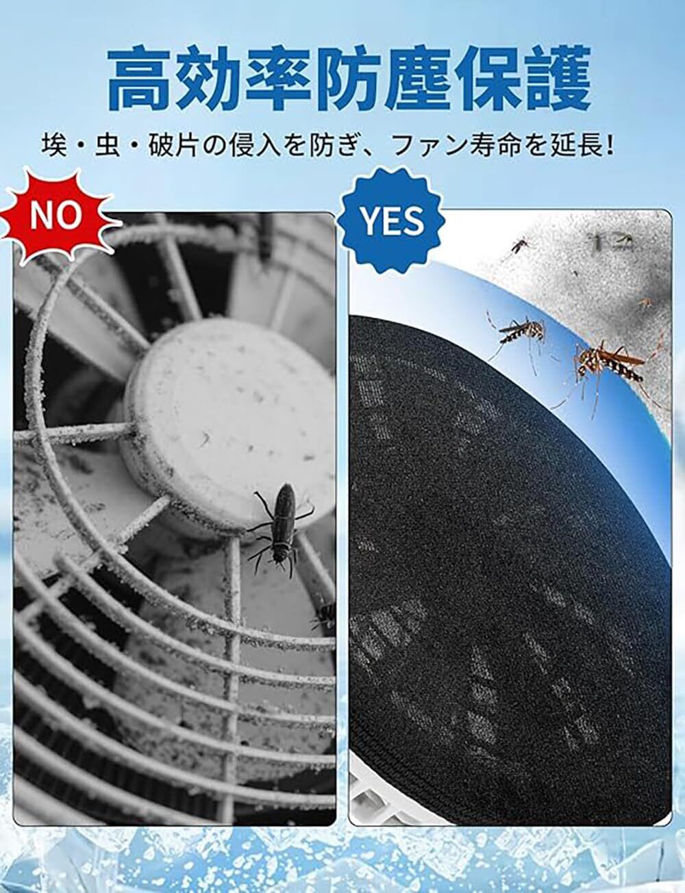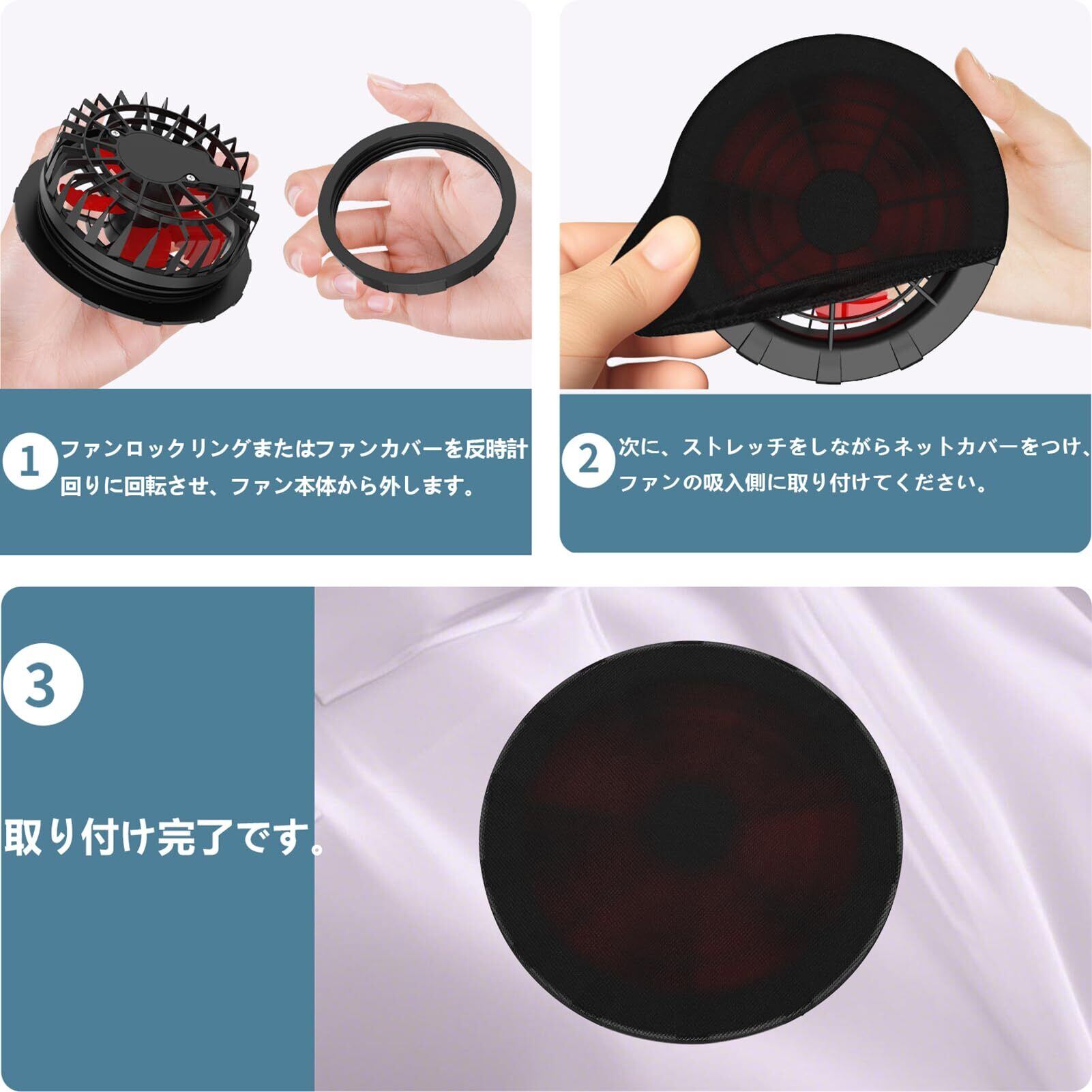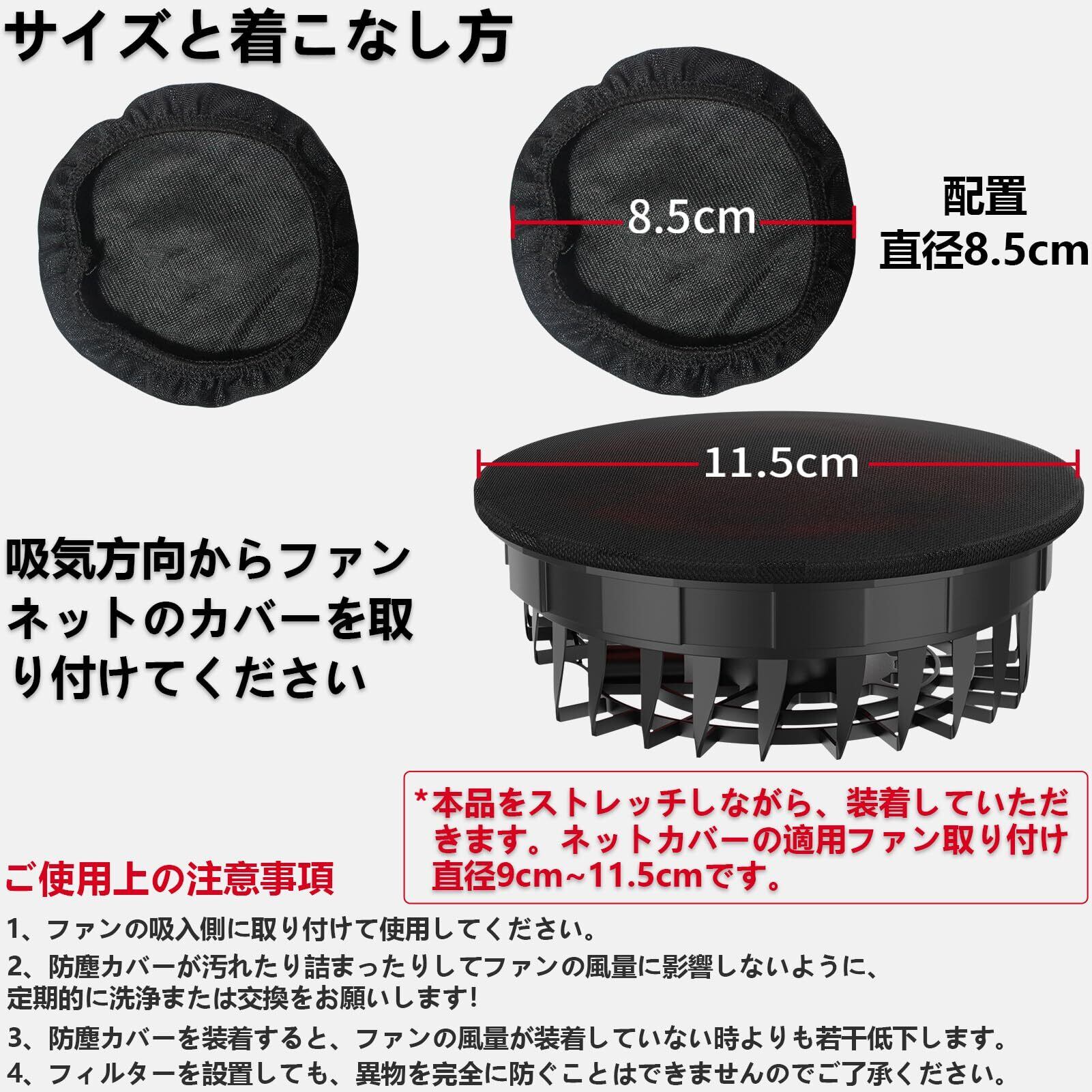 【実用性高い】ファンの最大取り付け直径が11.5cmまで可能で、自社製品だけでなく、市販の95%の作業着ファンとも互換性があります(ネットカバーの適用ファンは取り付け直径9cm~11.5cm)。※設置後はファンの風量が非設置時よりも減少しますのでご注意ください。