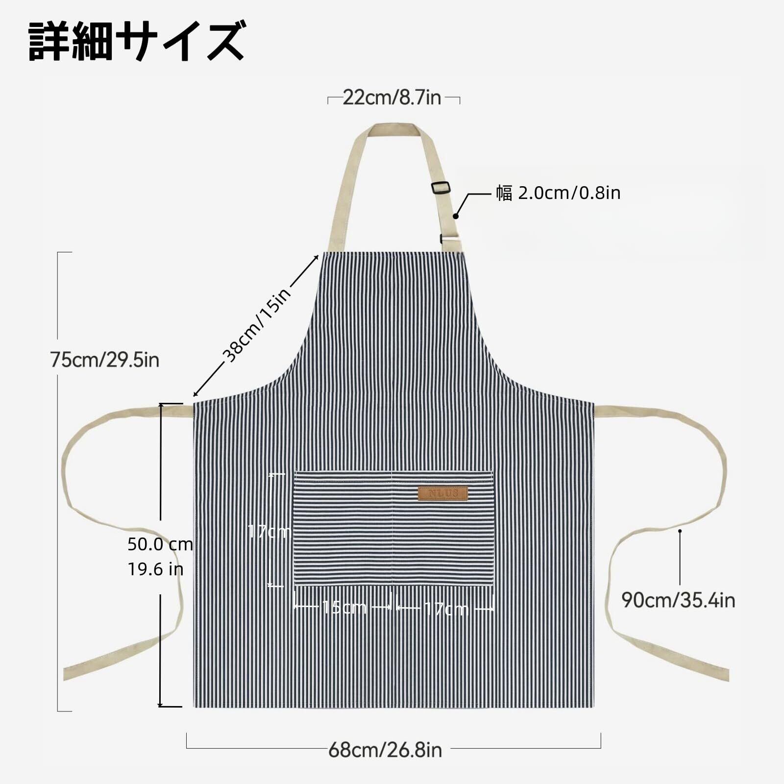 【サイズ】エプロンは全長約90 cm(頭紐を含む)、幅67 cm。ベルトは長さ90 cm、幅17 cm高さ18 cmの大きなポケットが2つあります。身長155 cm-180 cmの任意の体型の人におすすめです(人工的な測定のため誤差が生じる場合がありますのでご了承ください)。