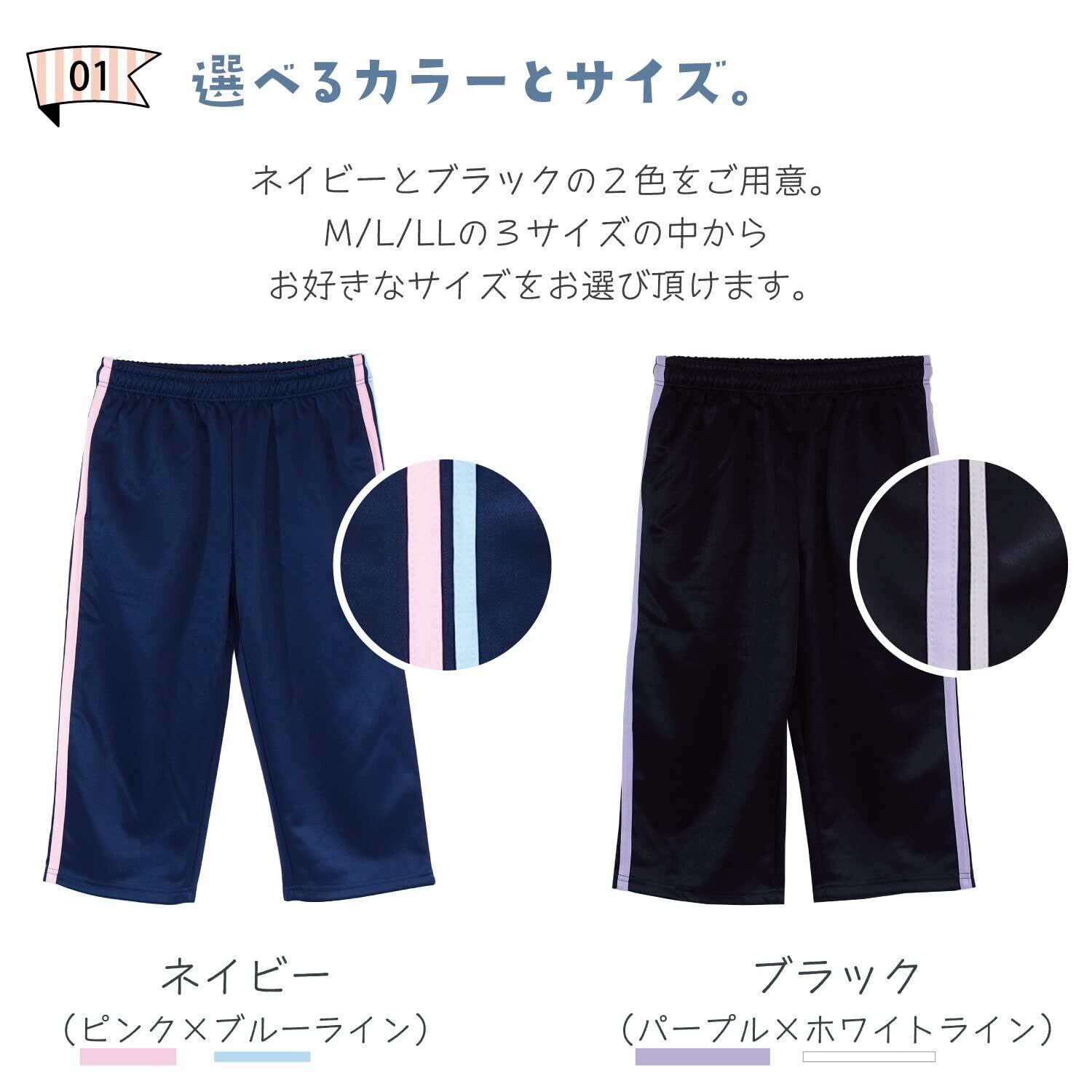 【選べるカラーとサイズ】ネイビーとブラックの2色をご用意。M/L/LLの3サイズの中から、お好きなサイズをお選びいただけます。ネイビーにはピンク×ブルーのライン、ブラックにはパープル×ホワイトのラインがサイドに入っています。