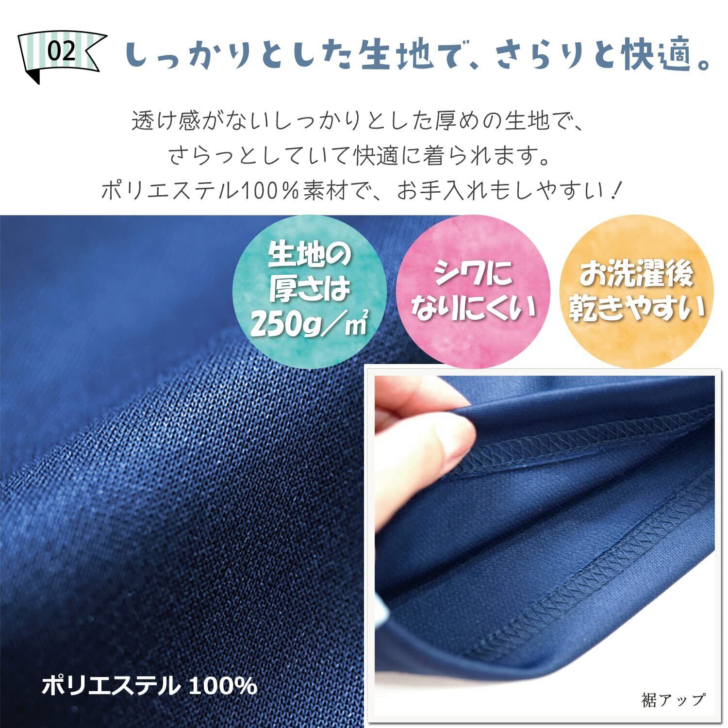 【しっかりとした生地感で、さらりと快適】透け感がない、しっかりとした厚めの生地(250g/㎡)で、さらっとしていて快適に着られます。ポリエステル100%素材でシワになりにくく、お洗濯後も乾きやすいので、お手入れもしやすいです。