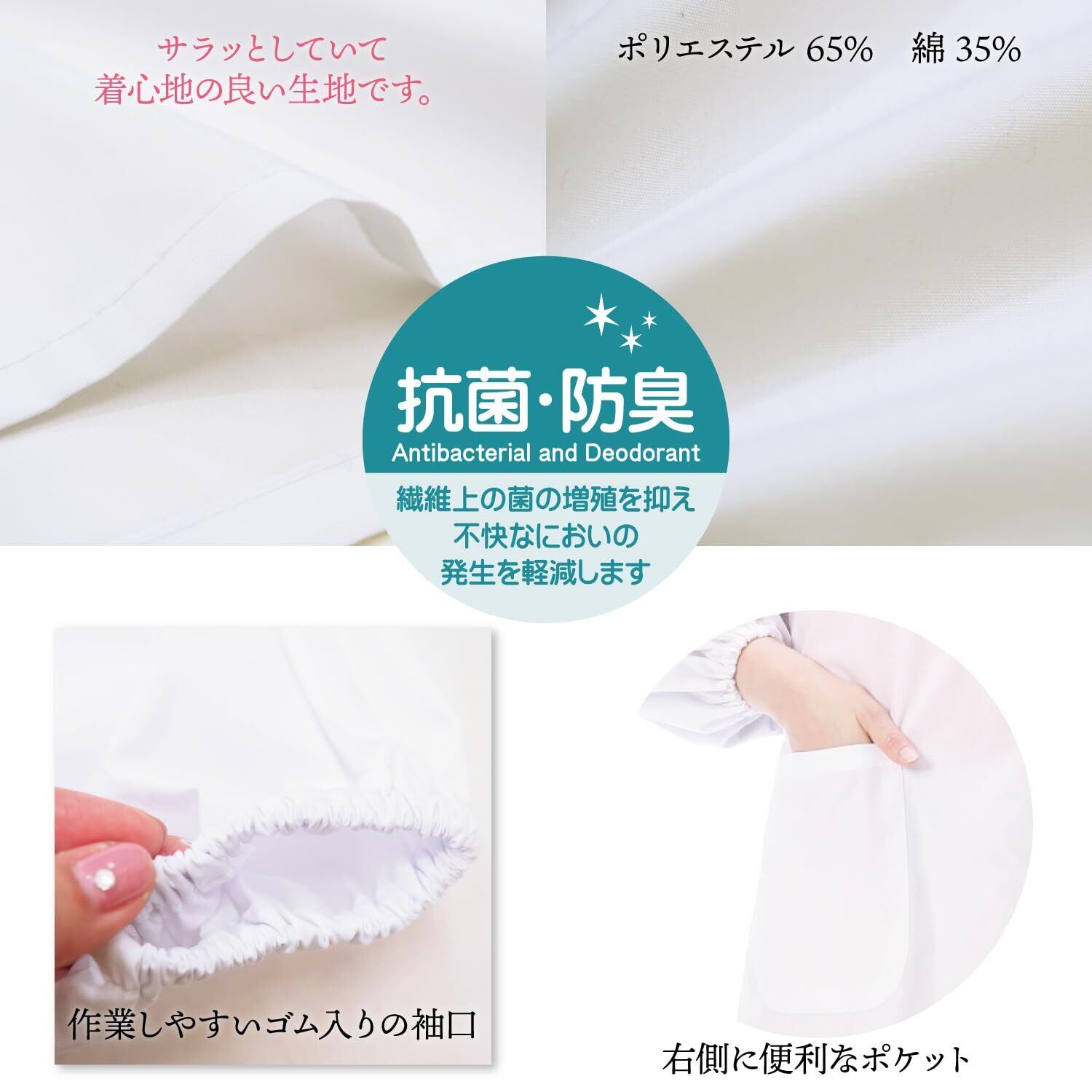 【抗菌・防臭加工】ポリエステル65% 綿35% サラッとしていて着心地の良い生地です。 抗菌・防臭加工を施しておりますので、繊維上の菌の増殖を抑え不快なにおいの発生を軽減します。 ※抗菌処理の薬剤を塗布しており特有のニオイがあります。気になる方は一度お洗濯してからのご使用をおすすめします。
