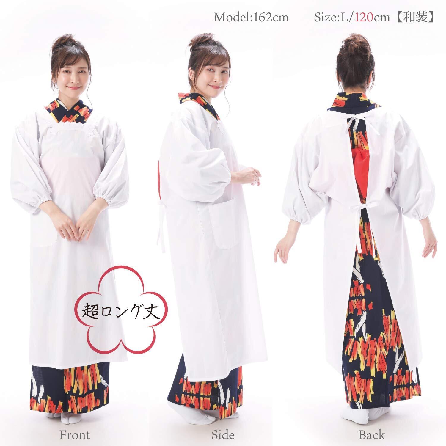 [ON NISHIKI] 割烹着 白 冠婚葬祭 フォーマル 和装用 着物でも 【選べる丈 120cm/100cm/85cm】 レディース ロング丈 綿ポリ ポケット付き 袖付きエプロン