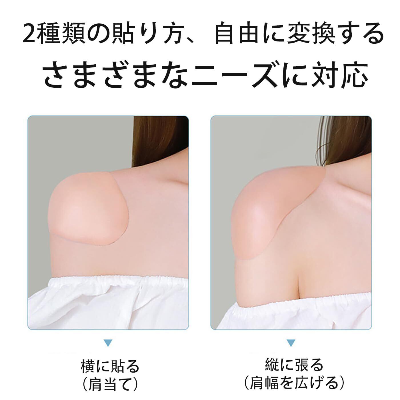 5. 簡単装着 肩パッドを肩に貼り付けるだけで、肩幅が広く見えてシルエットが美しくなります。着、脱もラクチンです。