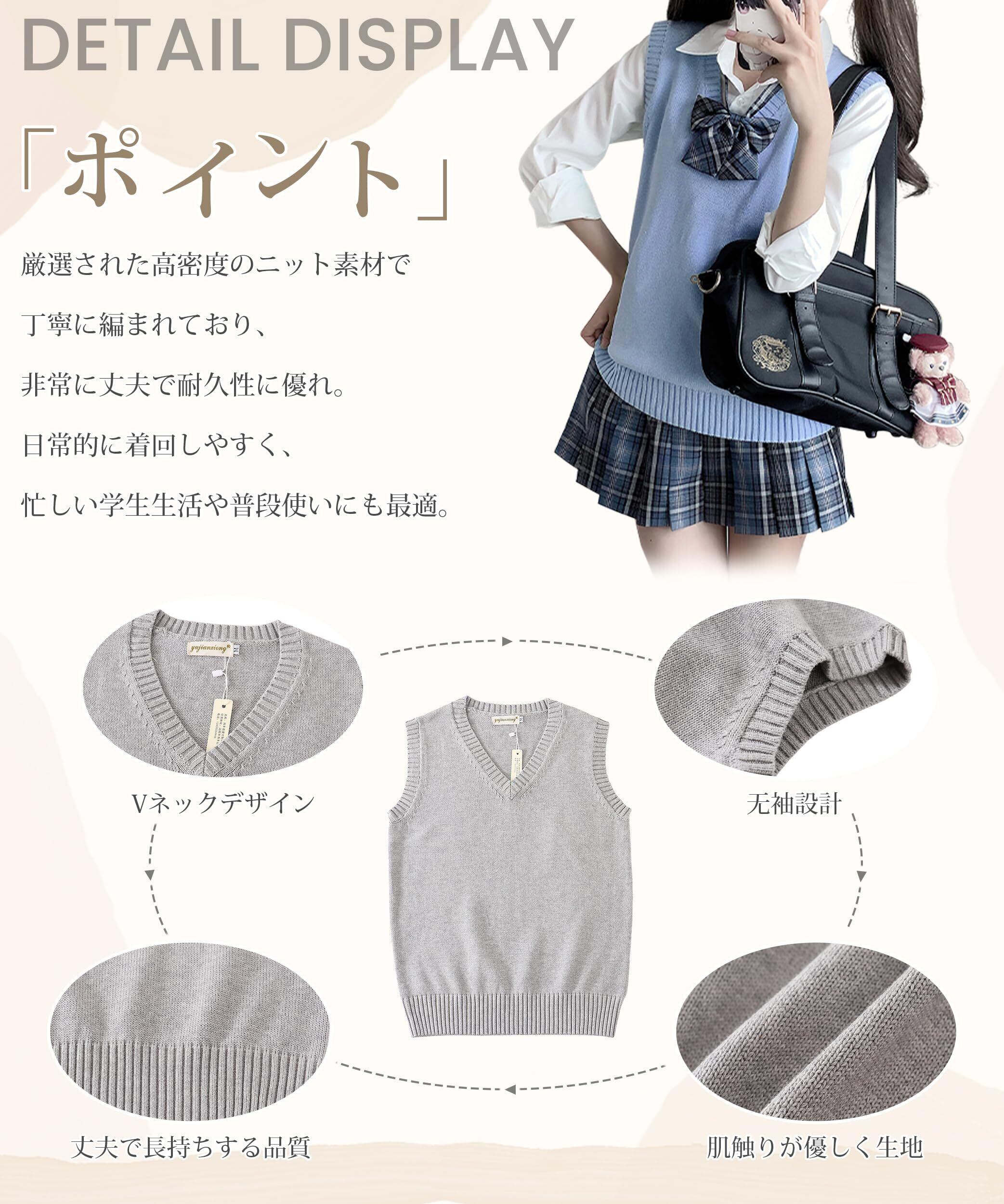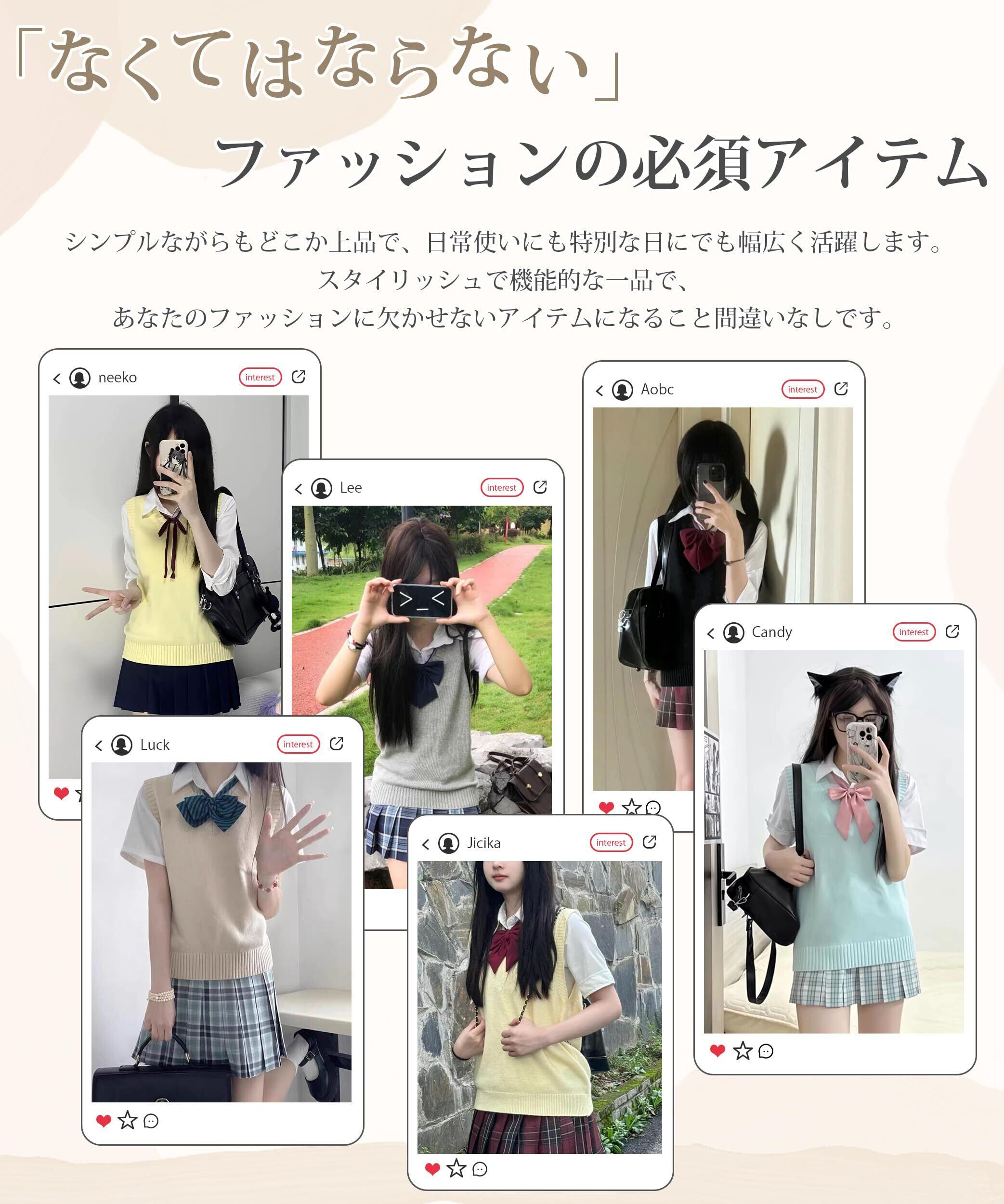 【可愛いお洒落な雰囲気を作る単品・重ね着スタイルベスト】AOYのスクールベストはシンプルなVネックと半袖デザインで、春夏秋冬、どの季節にもぴったりです❄️。AOYのスクールベストはシャツや長袖インナーと合わせることで、重ね着スタイルも楽しめ、可愛くお洒落な雰囲気を演出する欠かせないアイテムです。例えば、衿にリボンを合わせると、学生らしい可愛さが引き立ち、シンプルなシャツでもお洒落に決まります。また、寒い季節には長袖インナーと組み合わせれば、温かさとおしゃれを両立させることができます。さらに、このスクールベストは、高校生や中学生にぴったりで、カジュアルなコーディネートにも最適です。入学式や誕生日、バレンタインなどのプレゼントにも喜ばれるアイテムです。
