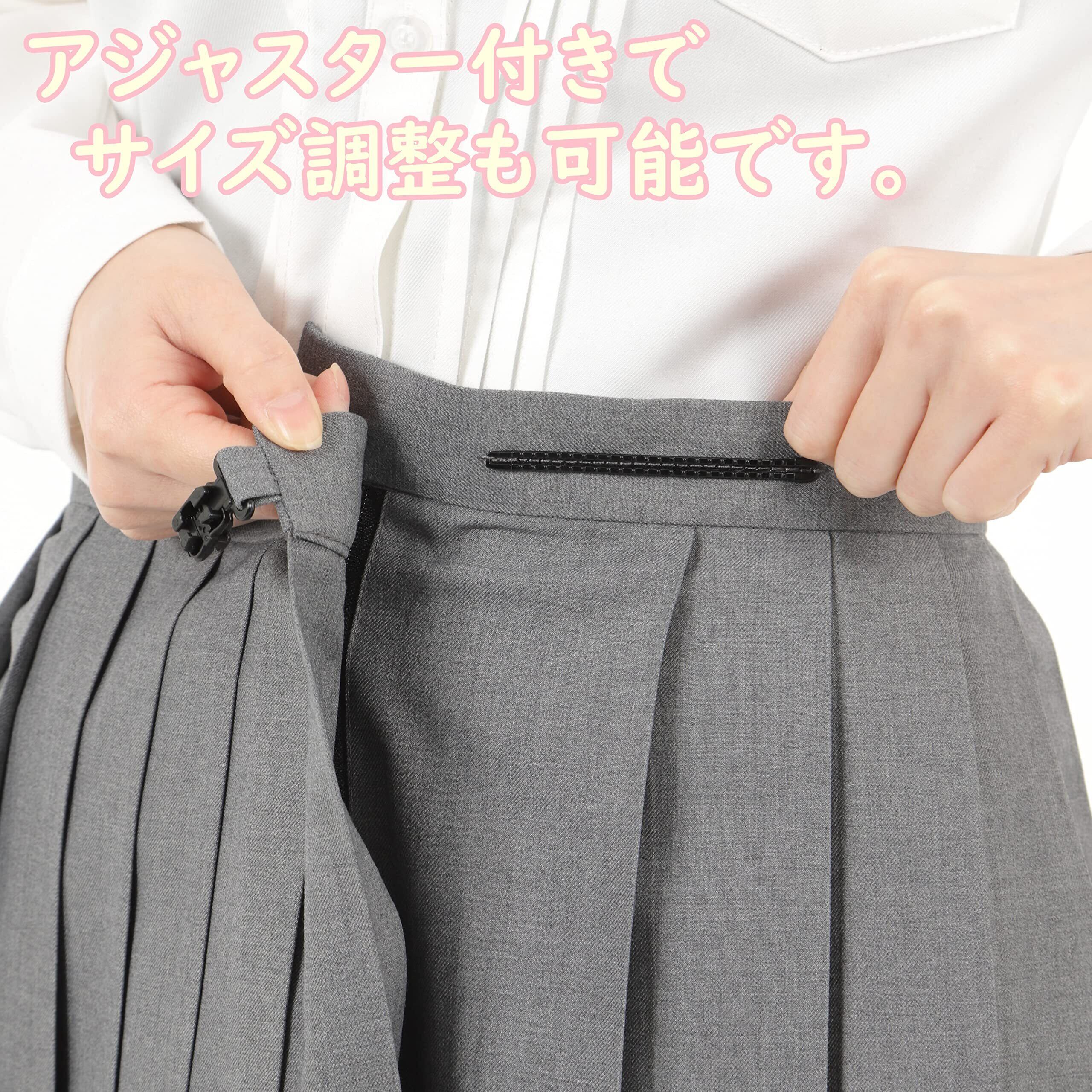 ウエストはアジャスター付きでサイズ調整が可能です。よくあるゴム仕様ではありません。又、左脇ポケット付きです。スカート丈は42cm、48cm、60cmで膝上ミニからひざ下までお好みに合わせることが出来ます。放課後や外出時等、必要であれば折り曲げれば短くする事が出来ますね。折り目正しいプリーツラインでお届けする為にお届け時は横糸が入っております。※検品時、抜くこともあるので必ずではないです。