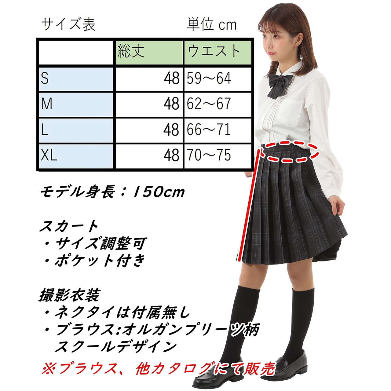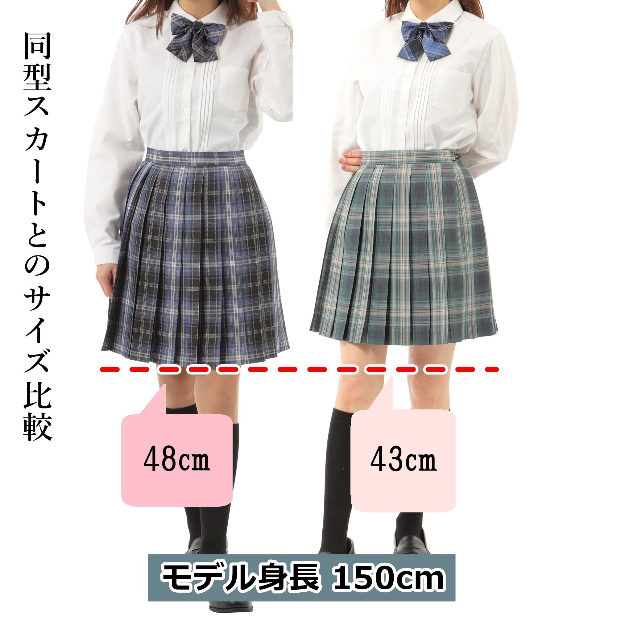 スカート丈は48cm。短すぎずに可愛く見せる長さです。(モデルの女性は身長150cmですので画像をご確認下さい。)放課後や外出時等、必要であれば折り曲げれば短くする事が出来ますね。ポケットもついており、ウエストはアジャスター付きでサイズ調整が可能です。