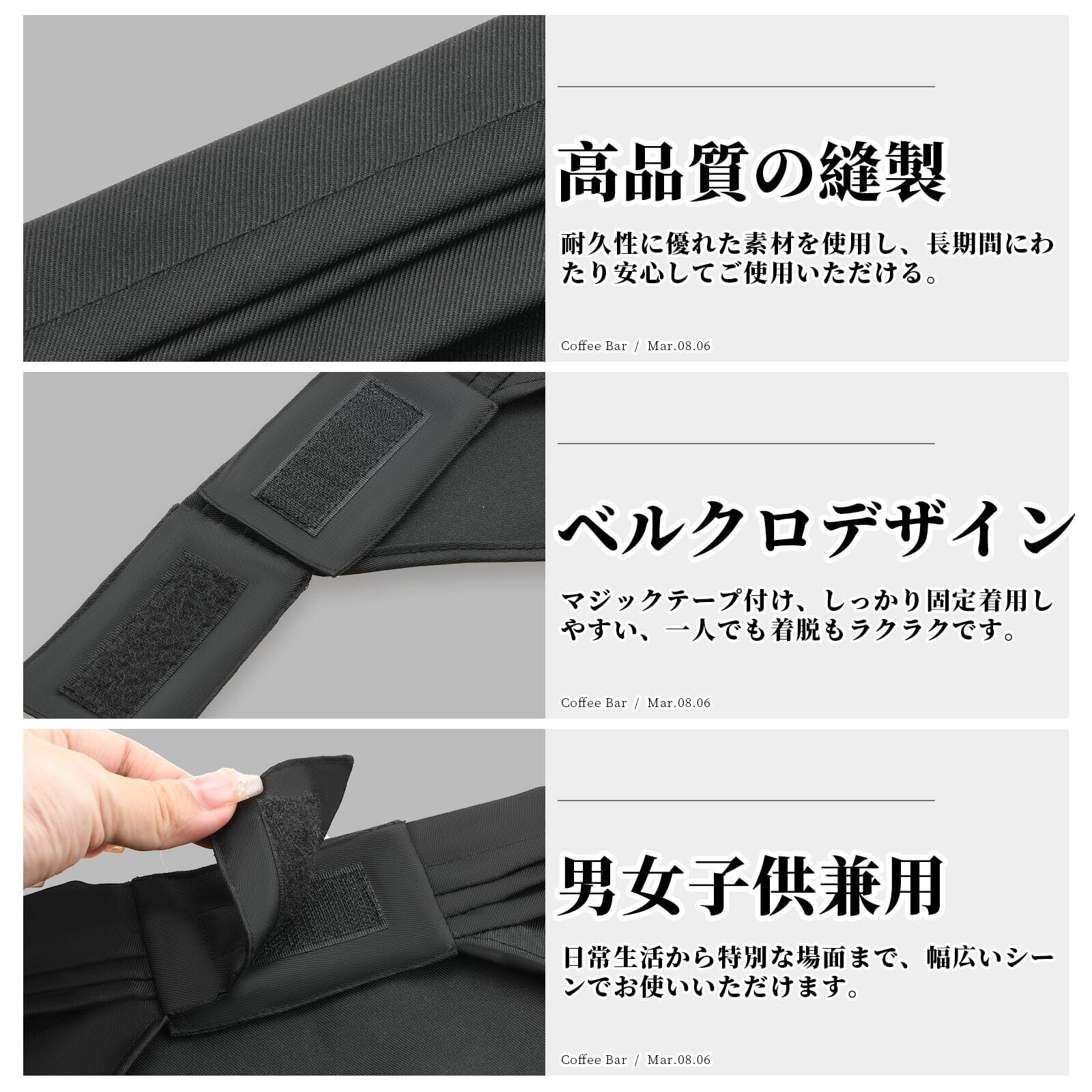【簡単に取り付けできる三角巾】マジックテープ付きで、簡単に脱着できます。サイズ調整も容易で、しっかりフィットするため、緩んだりずれたりすることなく、非常に使いやすいです。紐付きの三角巾よりもさらに簡単に調節でき、一人で着脱が可能です。