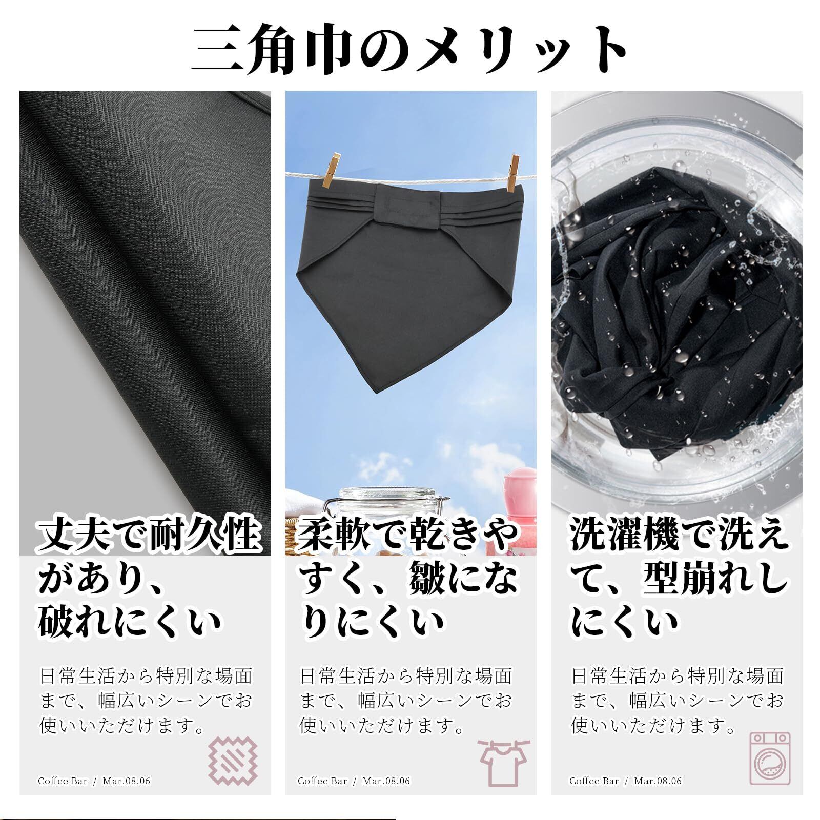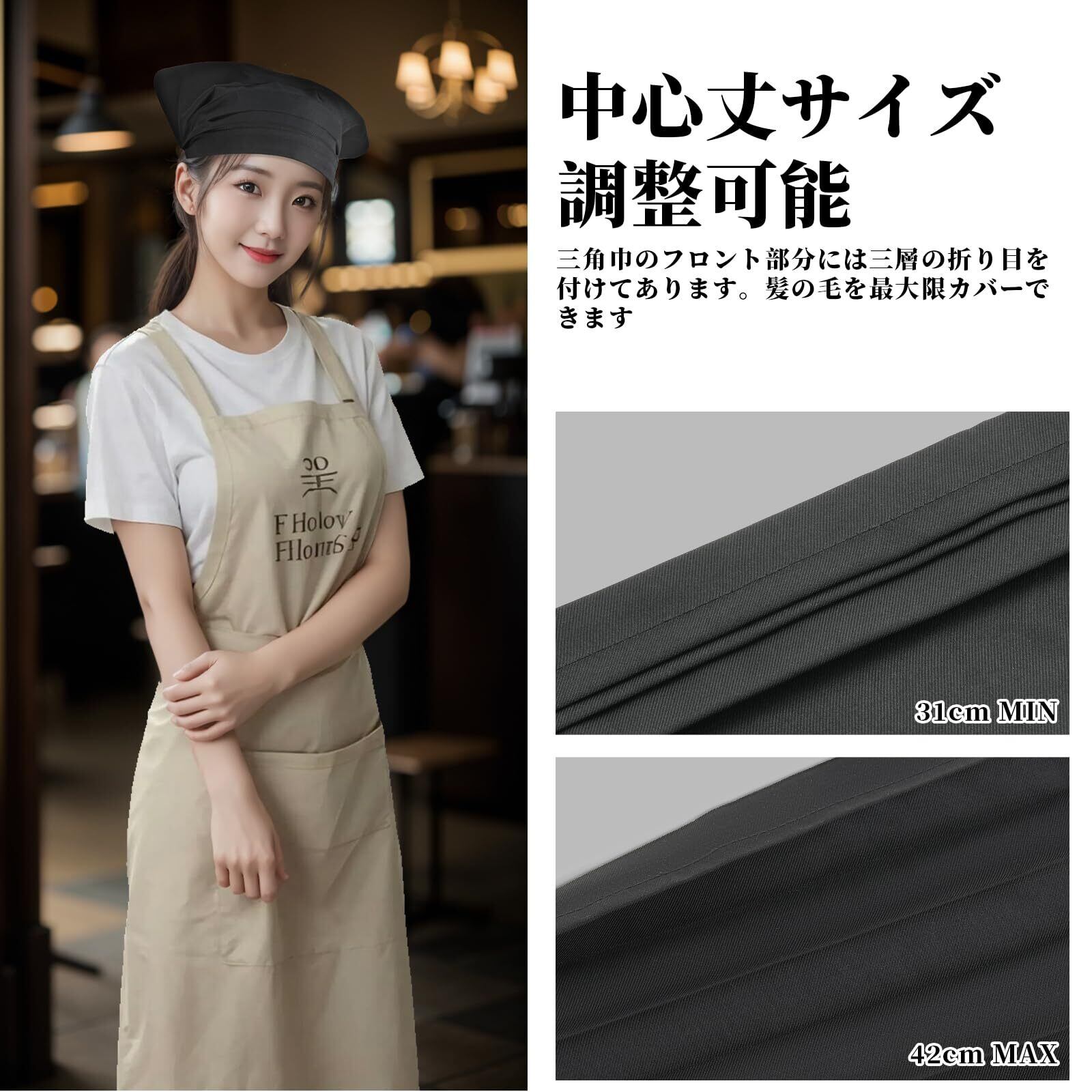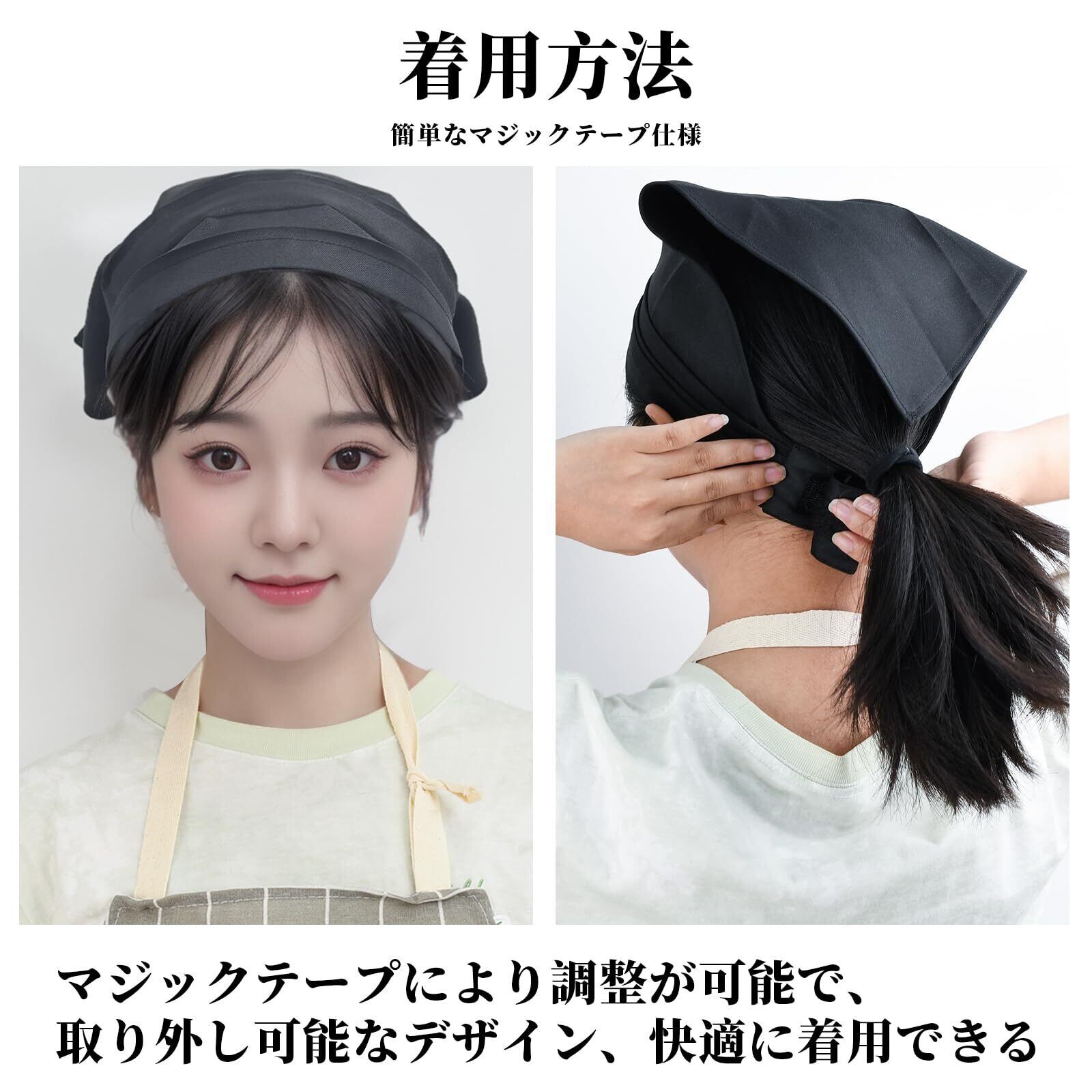 【製品の特徴】三角巾のフロント部分には三層の折り目があり、後頭部までの長さ調整が可能です。髪の毛最大限カバーできます。