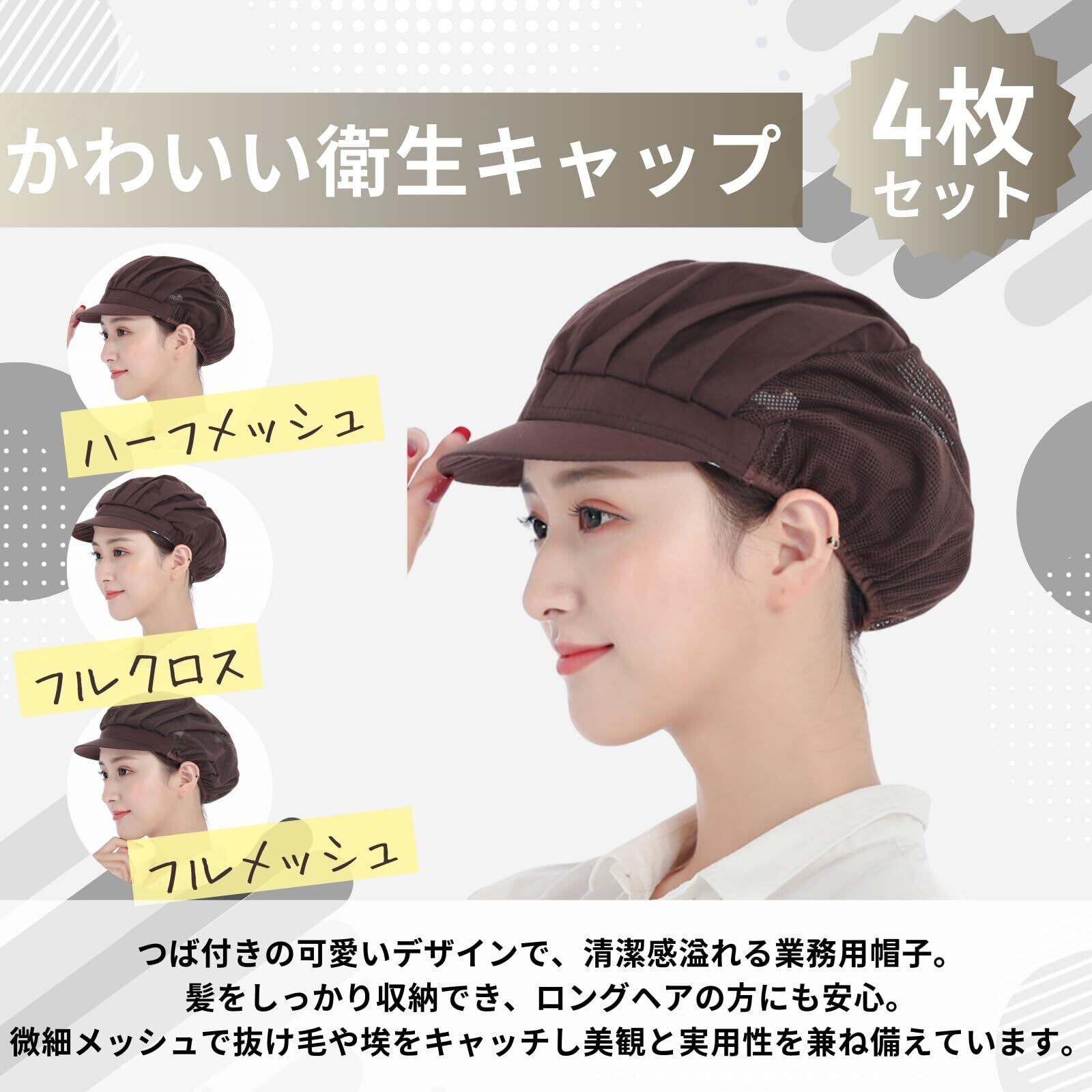 【かわいい衛生キャップ】つば付きの可愛いデザインで、清潔感溢れる業務用帽子。髪をしっかり収納でき、ロングヘアの方にも安心。微細メッシュで抜け毛や埃をキャッチし、美観と実用性を兼ね備えています。