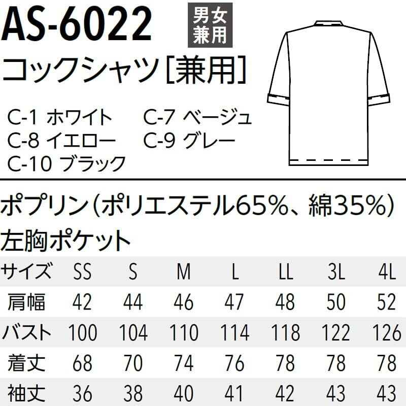 [アルベ] アルべ コックシャツ 兼用 五分袖 シングルボタン 全5色 SS~4L 飲食 厨房 レストラン 制服 ARBE AS6022