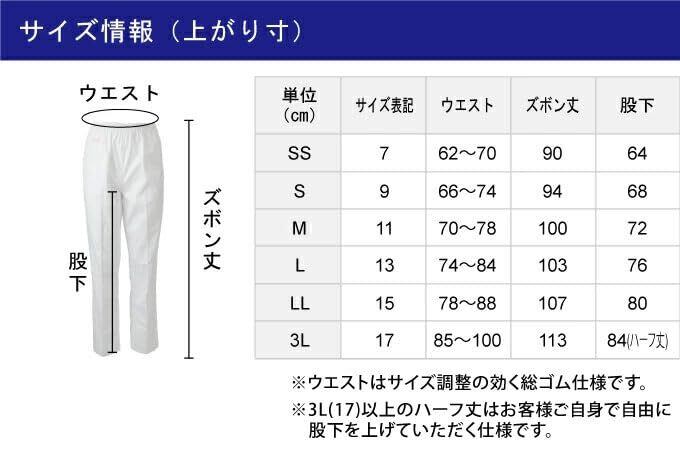 <素材:ポリエステル65%・綿35% 帯電防止T/Cツイル> <サイズ構成> 7(SS):ウエスト62~70 ズボン丈90 股下64 9(S):ウエスト66~74 ズボン丈94 股下68 11(M):ウエスト70~78 ズボン丈100 股下72 13(L):ウエスト74~84 ズボン丈103 股下76 15(LL):ウエスト78~88 ズボン丈107 股下80 17(3L):ウエスト85~100 ズボン丈113 股下84