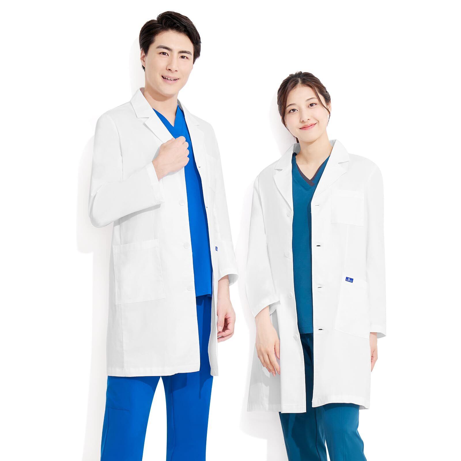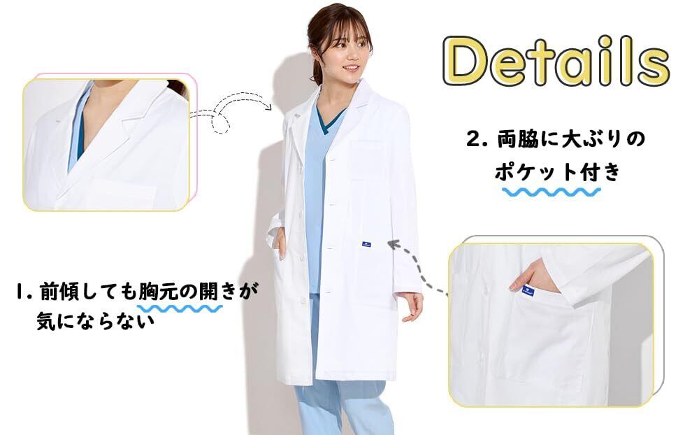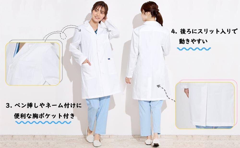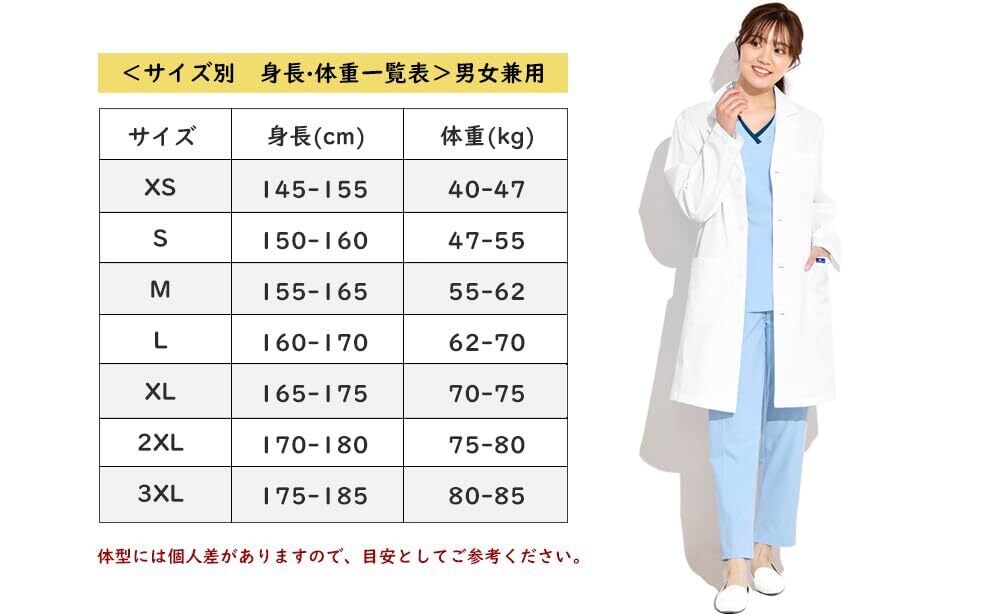 豊富なサイズ展開。医師、看護師、歯科助手、医学生および看護学生、病院職員、薬剤師、その他医療分野の職業に最適です。実験用白衣、研究職や教職の方などにもオススメです。