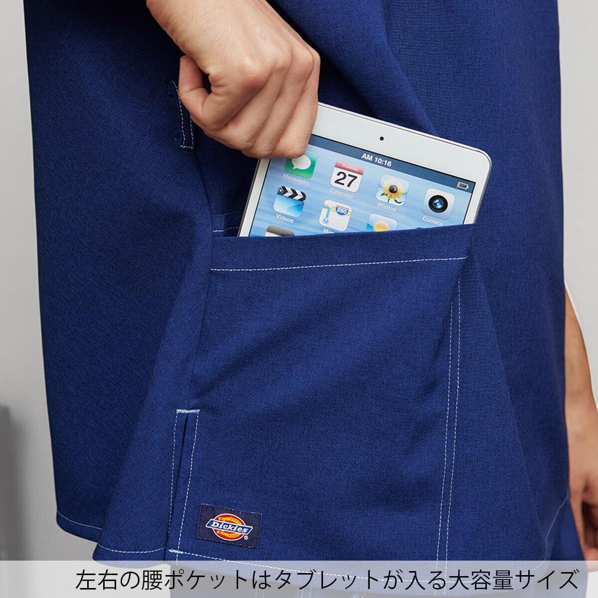 洗濯性に非常に優れた新開発のシャンブレー調の生地を採用。汚れが落ちやすく、イージーケア性に優れ、洗濯を繰り返しても効果が持続するのが特徴のディッキーズスクラブです。 ダブルステッチでデニム風のデザイン。 吸湿速乾性があり、動きやすいストレッチ素材の生地なので洗いざらしのような独特の風合いも魅力。 持ち運びに便利なタブレットが入るサイズの左右ポケットと右裾にはディッキーズのロゴがアクセントで付いています。持ち運ぶ機会が多い携帯電話の収納ポケットと右肩に携帯電話のストラップを結びつけられるループ付きなので、首にストラップをかけずに携帯電話を持ち運びできます。 便利なループ付きの右腰の小分けポケットは、サージカルテープやはさみなど小物類の収納に。左腰にもポケット付き。 左胸ポケットにはディッキーズカラーのピスネームがアクセントとなっており、左袖にディッキーズロゴの刺繡付きポケットあり。