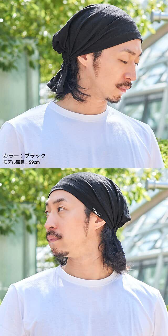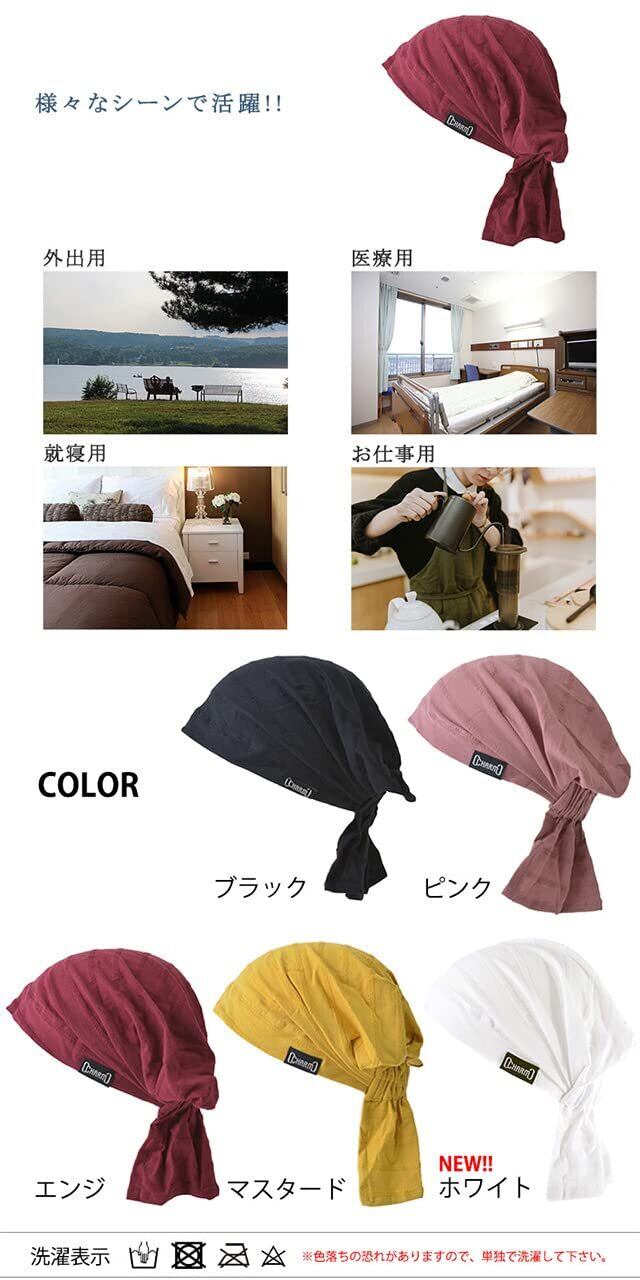 【様々なシーンで大活躍のバンダナキャップ】後頭部にはゴムが入っているのでしっかりと伸縮。サイズ調整しやすく、高さもあるので耳後ろまでかぶれます。少し変わった後頭部のデザインもオシャレに決まり、外出用ターバンとしても医療用帽子・就寝用キャップとしても最適。